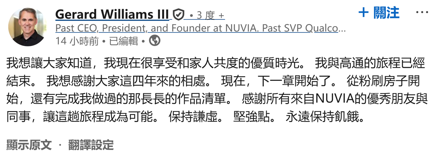 离开苹果后,杰拉德 · 威廉姆斯三世自立门户成立 NUVIA 公司,随后高通于 2021 年以 14 亿美元收购这家公司,杰拉德 · 威廉姆斯三世也顺势加入高通,担任高级工程副总裁。他领导开发 Oryon CPU 架构(原 Nuvia Phoenix),后来成为骁龙 8 Elite Gen 5(第五代骁龙 8 至尊版)、骁龙 X Elite 的重要技术基础。