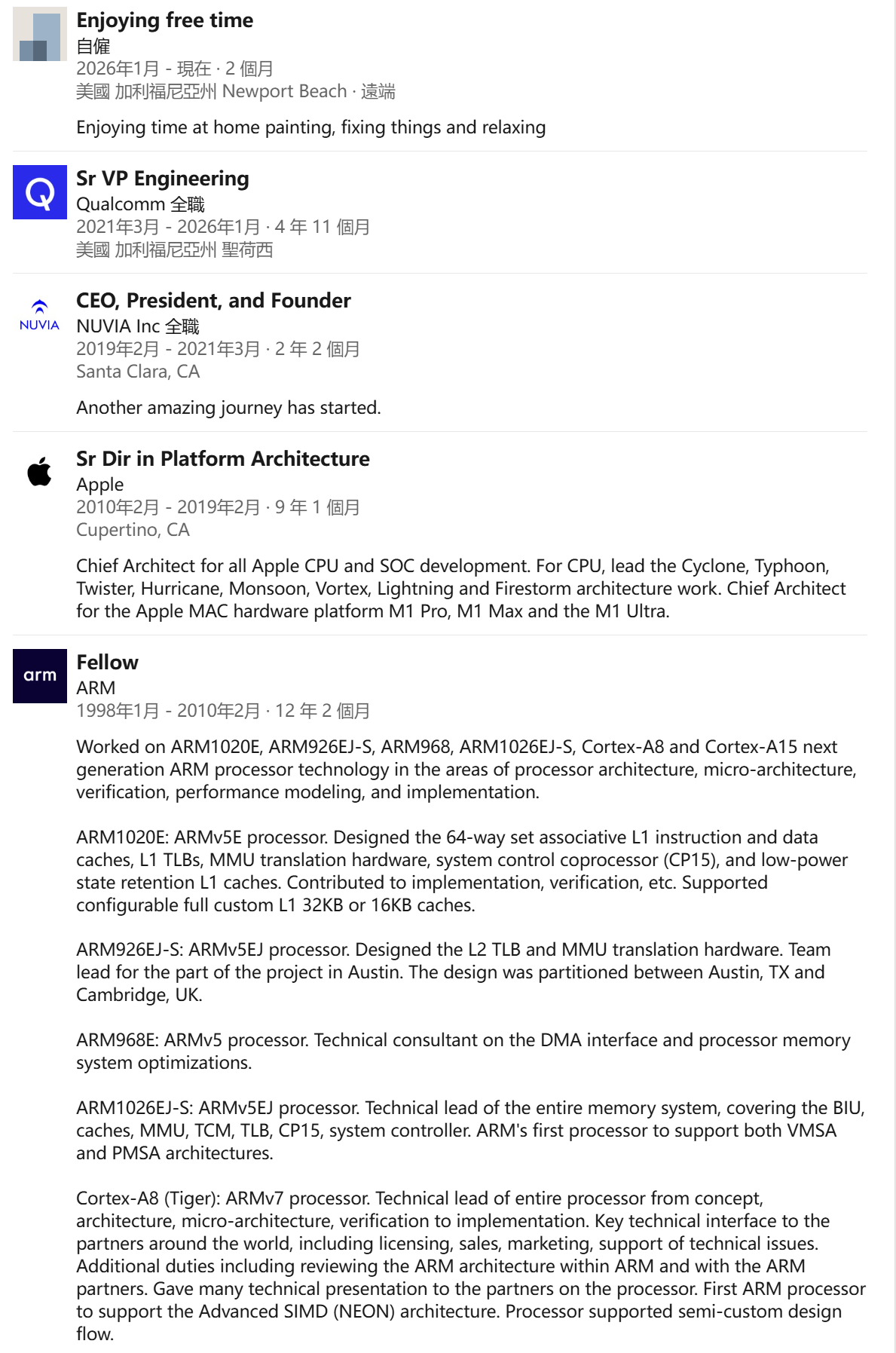 从 Arm 跳槽到苹果后,他担任了 A12X-A17 等移动端自研芯片的首席架构师,同时还是 60 多项苹果专利的发明人,主要涵盖功耗管理、多核调度等技术。