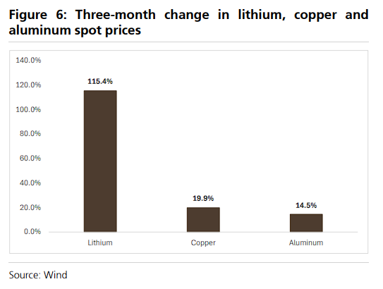 比如在上周一,瑞银就发布了一份报告,说过去三个月内,锂涨了 115.4% ,铜涨了 19.9% ,铝涨了 14.5% ,将导致一辆中型电车的生产成本提高 4000 到 7000 人民币。