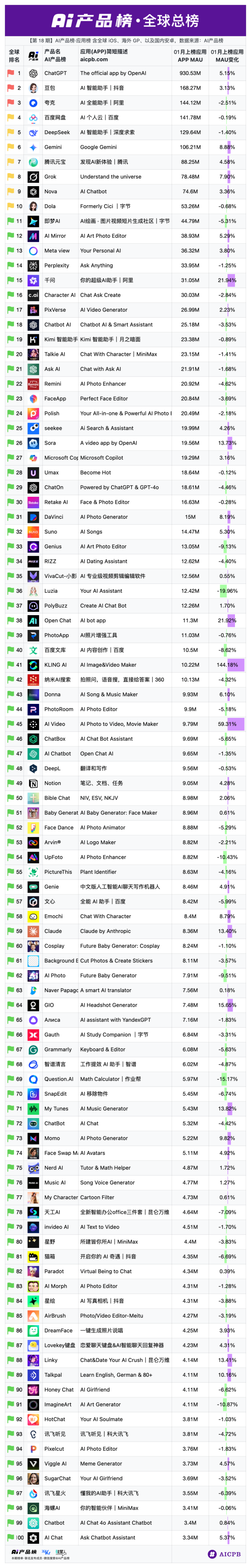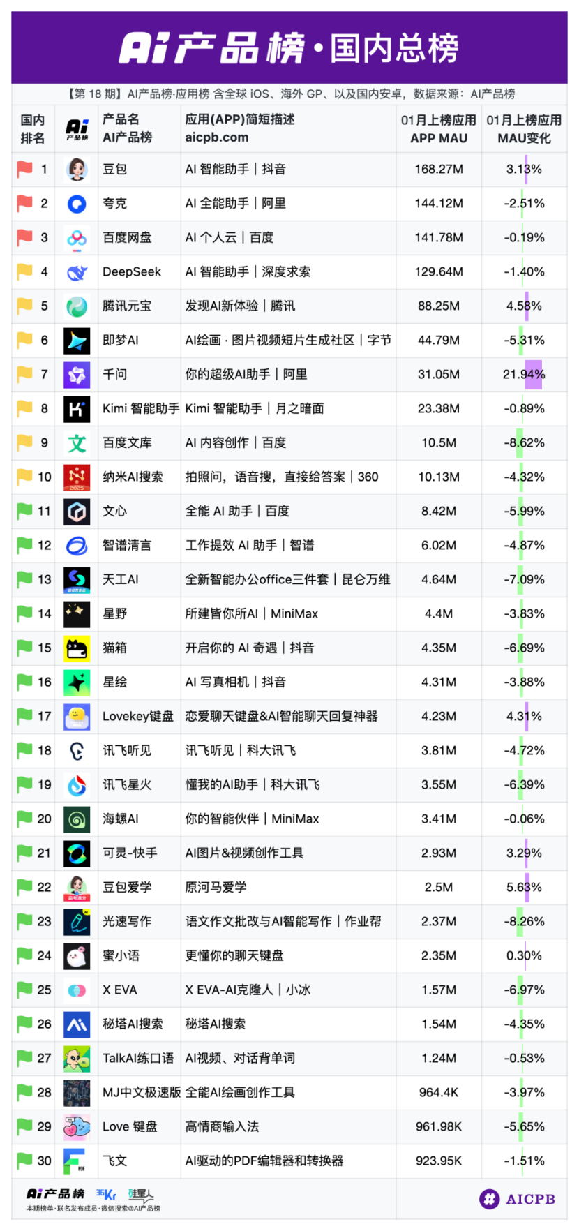 现在请开始欣赏 AI 产品榜·应用榜 (APP)2026 01 月榜单: