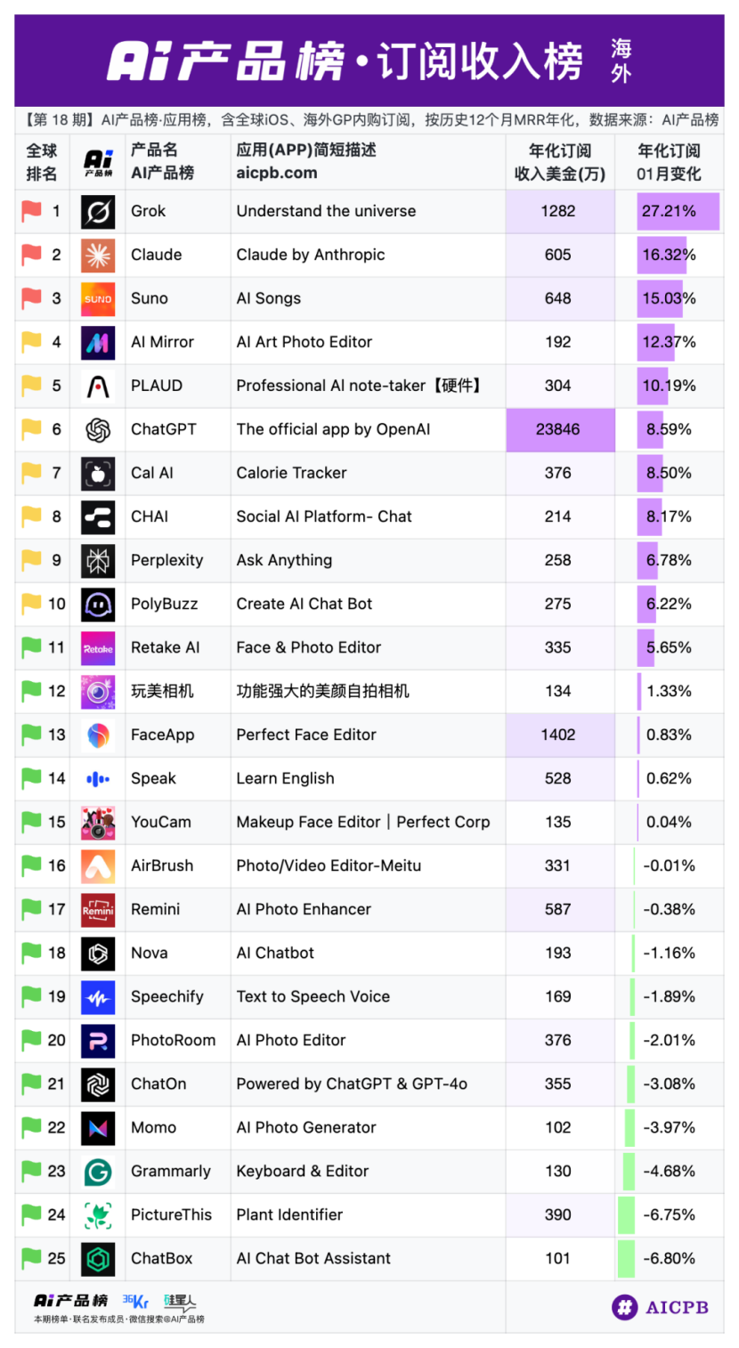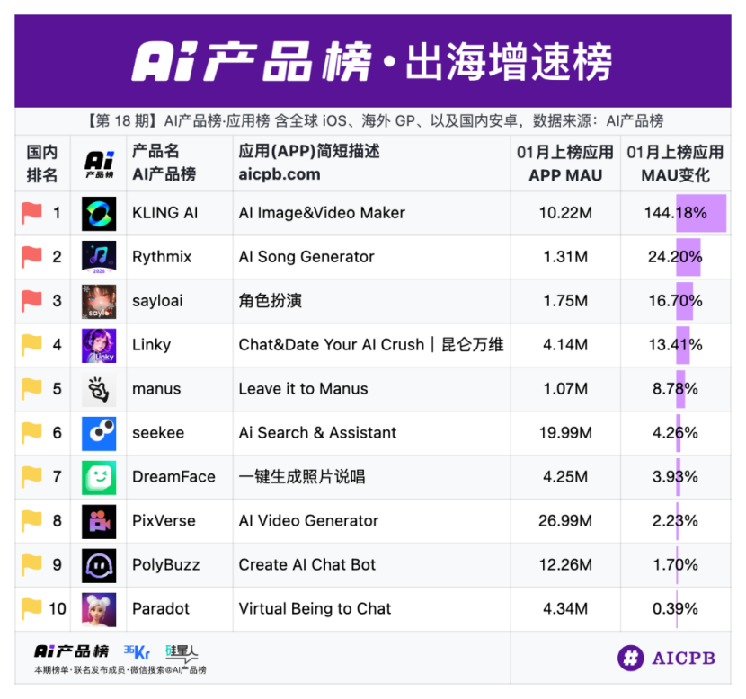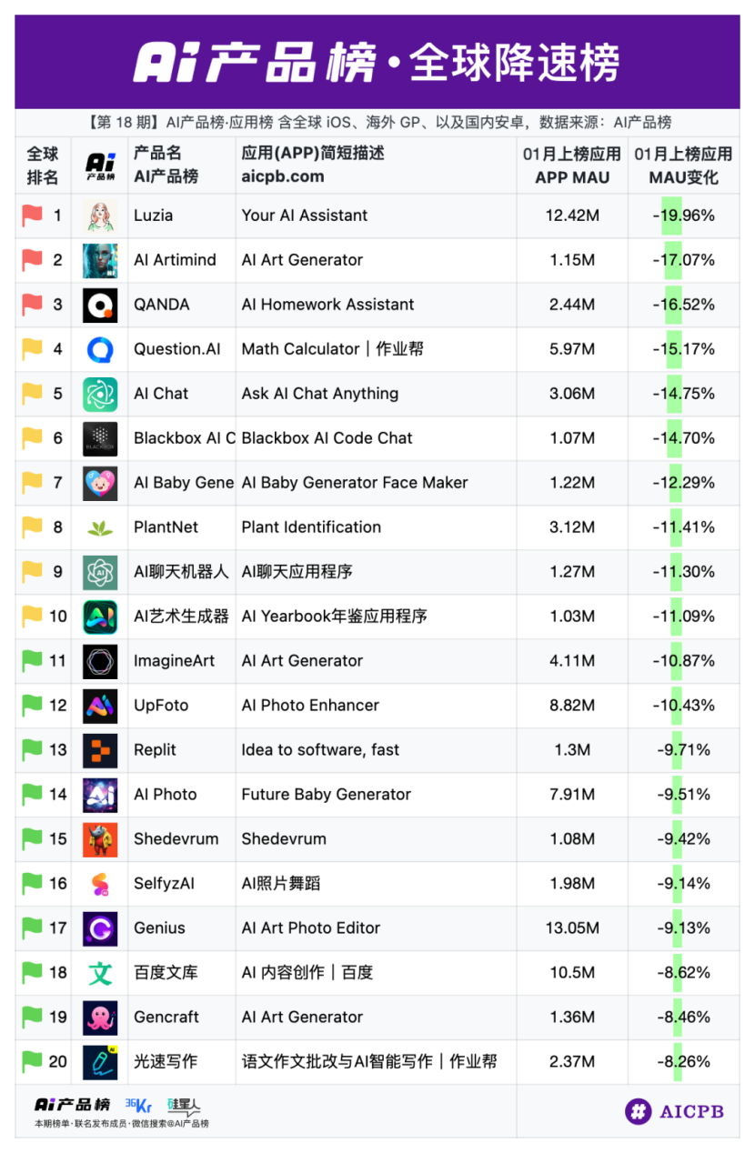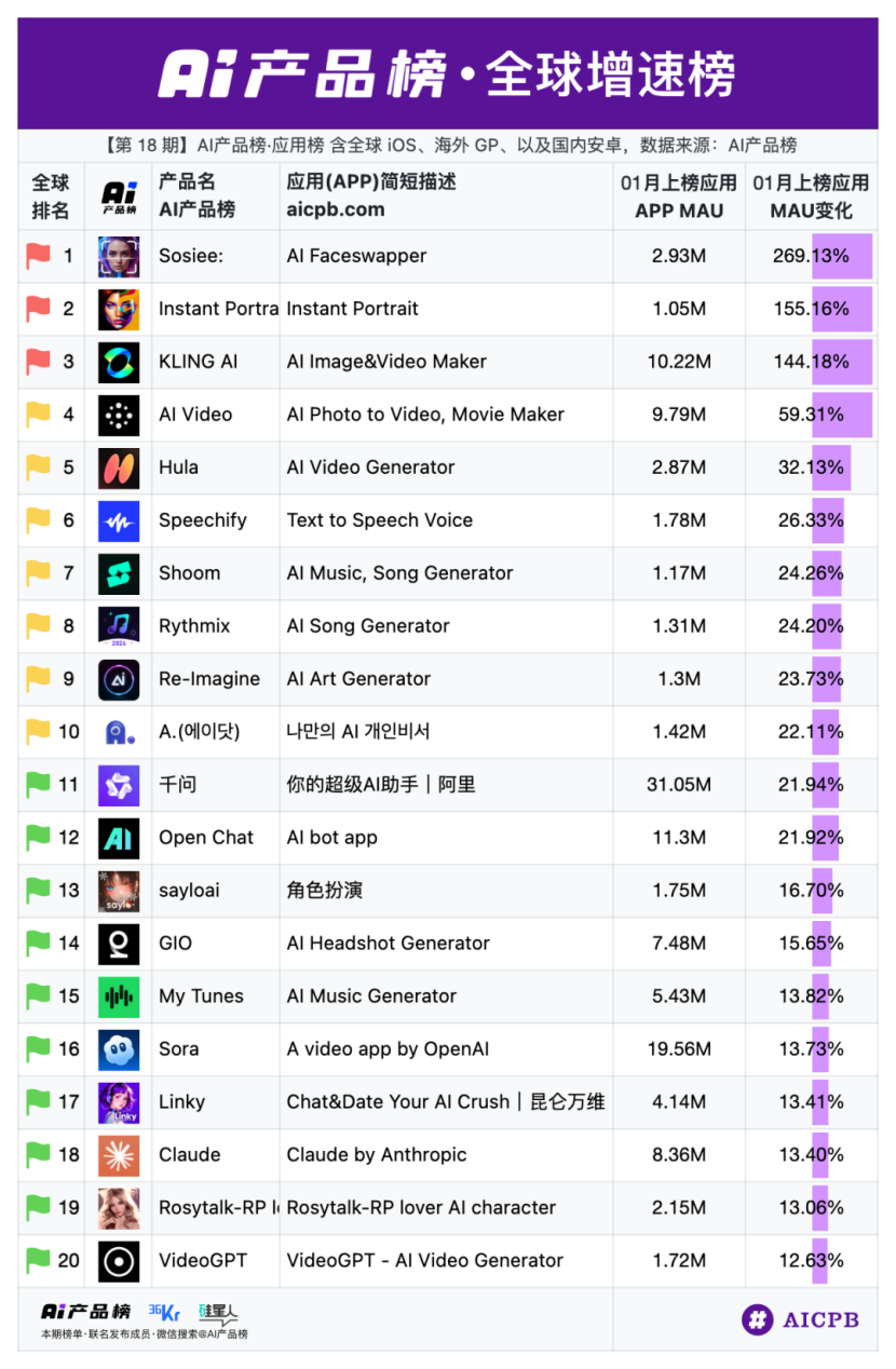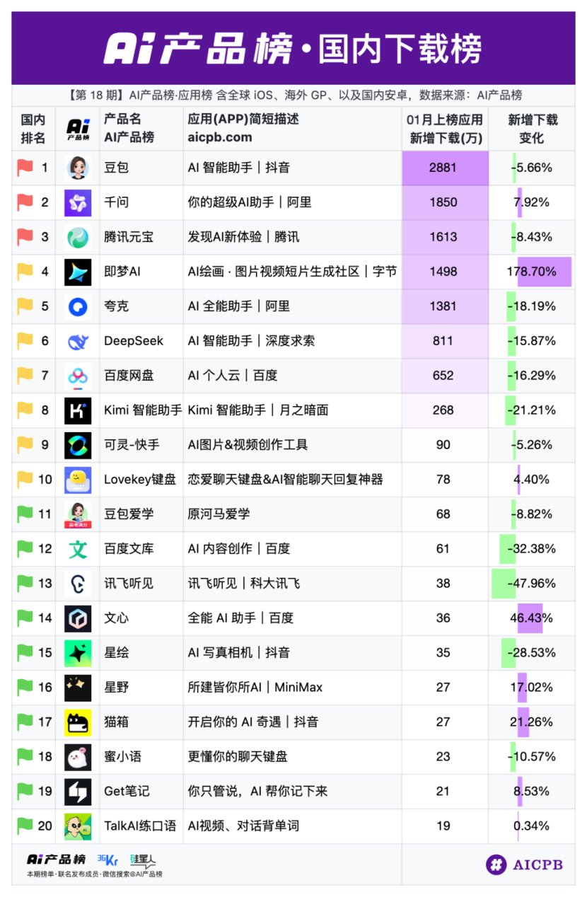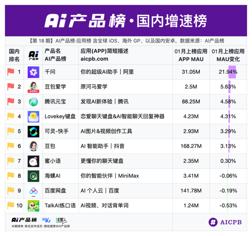 18 AI 产品榜·应用榜 (APP) 2026 01 月榜)由 AI 产品榜、 36kr 、硅星人联名发布。