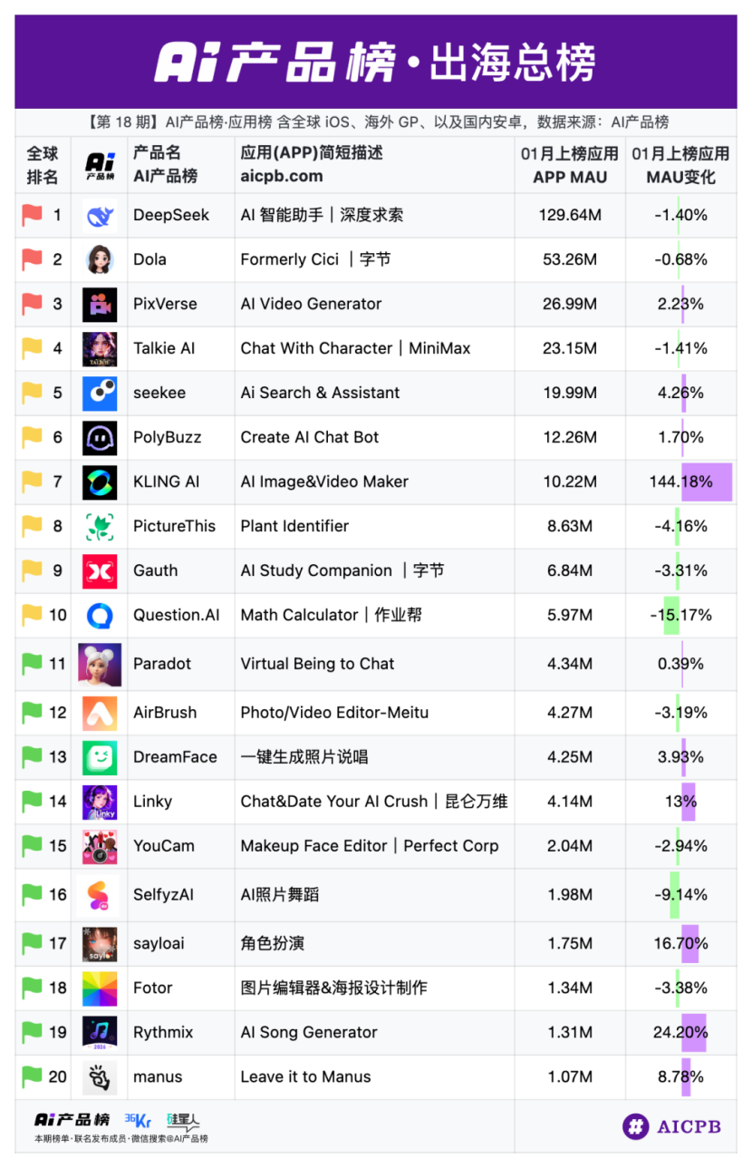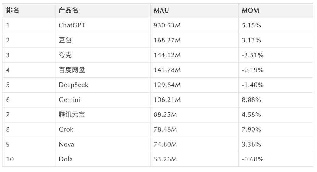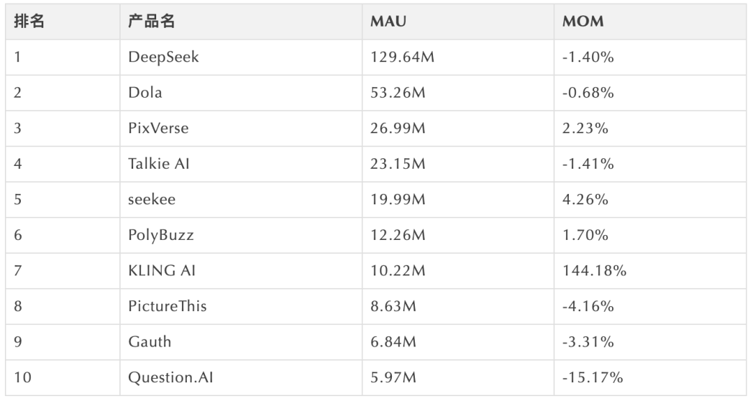 AI 产品榜·出海总榜 TOP10 DeepSeek 1.29 亿 MAU 登顶,排名第二的是 Dola 字节旗下豆包海外版 MAU 53.26M ,环比微跌 0.68%