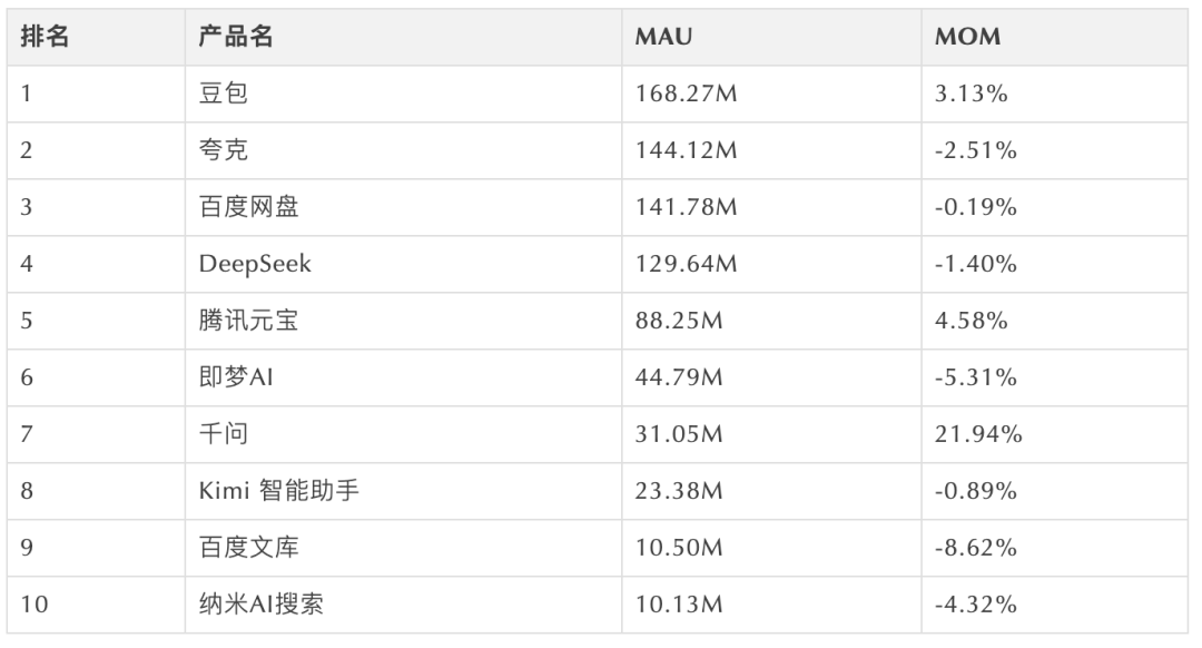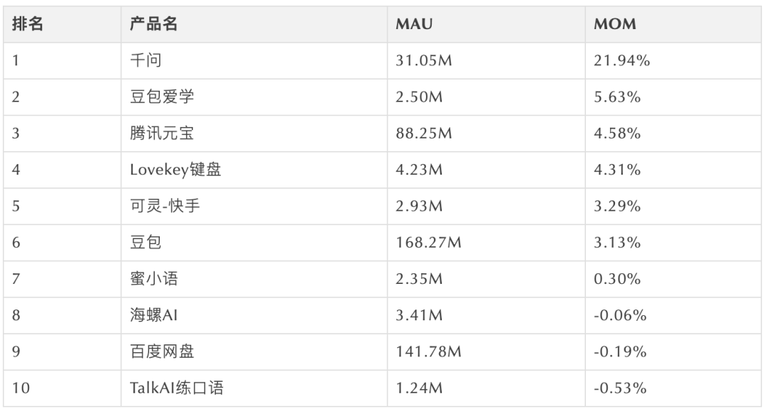 本月表现最亮眼的,非千问莫属,以 31.05M MAU 排名第 7 ,环比增速高达 21.94% ,是国内榜单里涨得最快的选手,没有之一!比其他选手高出一大截,按照这个趋势说不定很快就能冲进国内第一梯队 另外,腾讯元宝也很稳, 4.58% 的环比增速,把 MAU 冲到 88.25M ,稳稳守住国内第五