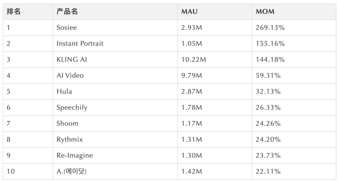 AI 产品榜·应用榜·国内增速榜 TOP10