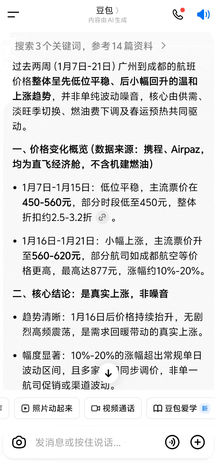 这种做法吧,说是说提供情绪价值 ,但是能把 AI 从一个搜索引擎的传声筒,变成了一个帮你整理烂账的咨询顾问,体验显然是升级了。即便它最后给出的结论和携程并无二致,但它帮你拆解「为什么这个价格合理」的过程,极大地缓解了用户在面对机票价格波动时的焦虑感。这种辅助做决策的心理价值,往往大于那几十块钱的价格差。