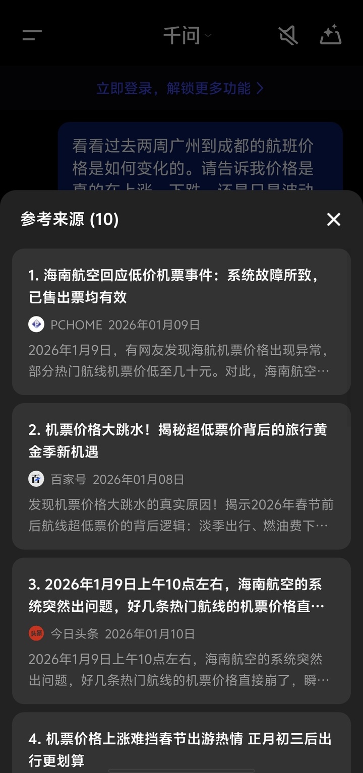 千问的信息源深度嵌入了国内的中文互联网生态,它能敏锐地捕捉到那些官方通稿之外的消息。比如前阵子海航订票系统的那个「超级 Bug 价」,在其它 AI 的被草草带过,或者被归类为「极端异常波动」,但千问能直接定位到具体的事故新闻,并给出「这并非常态价格,不建议作为回程参考」的决策建议。