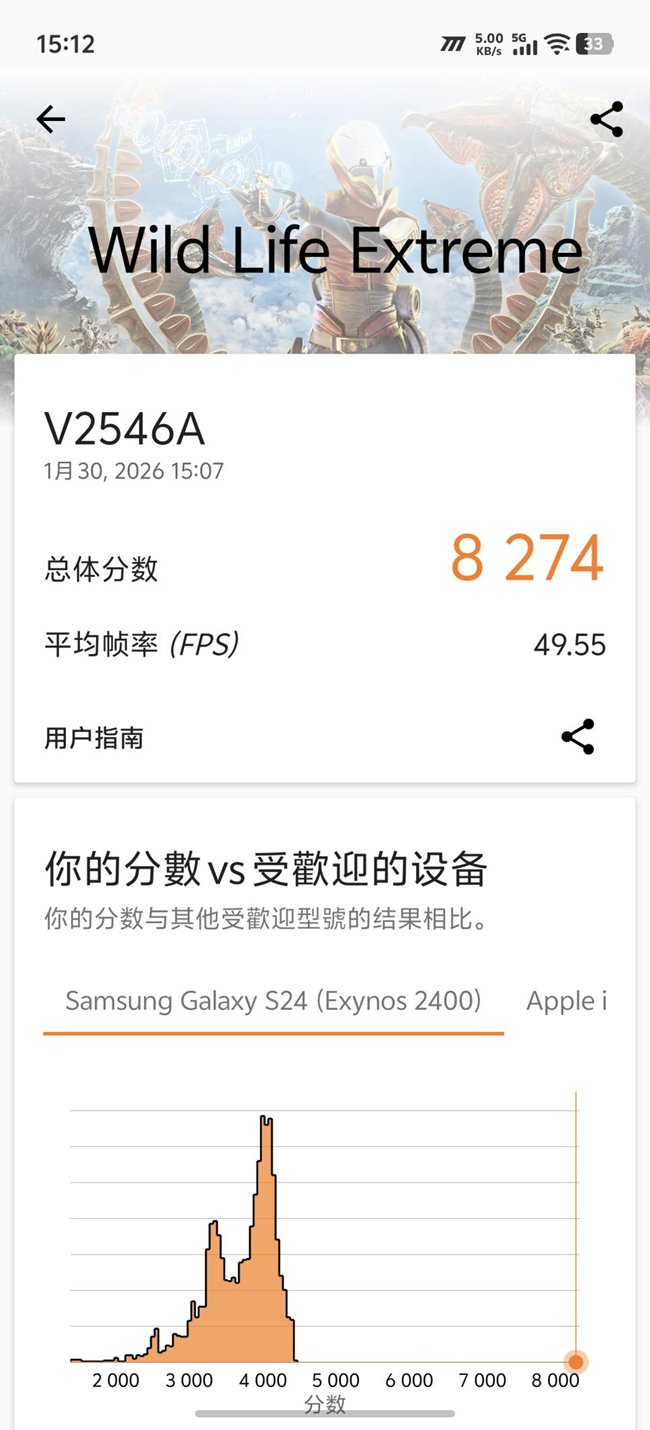 实际跑分更是直观印证了它的实力,将风扇开至疾速档,开启Monster模式:安兔兔综合成绩突破450万,Geekbench 6单核达到3543分、多核突破11185分,图形测试中3DMark Wild Life Extreme也取得了8274的高分。无论是理论数据还是实际负载,它都展现出了当前安卓阵营第一梯队的强悍性能,足以流畅驾驭各类大型游戏与多任务场景。
