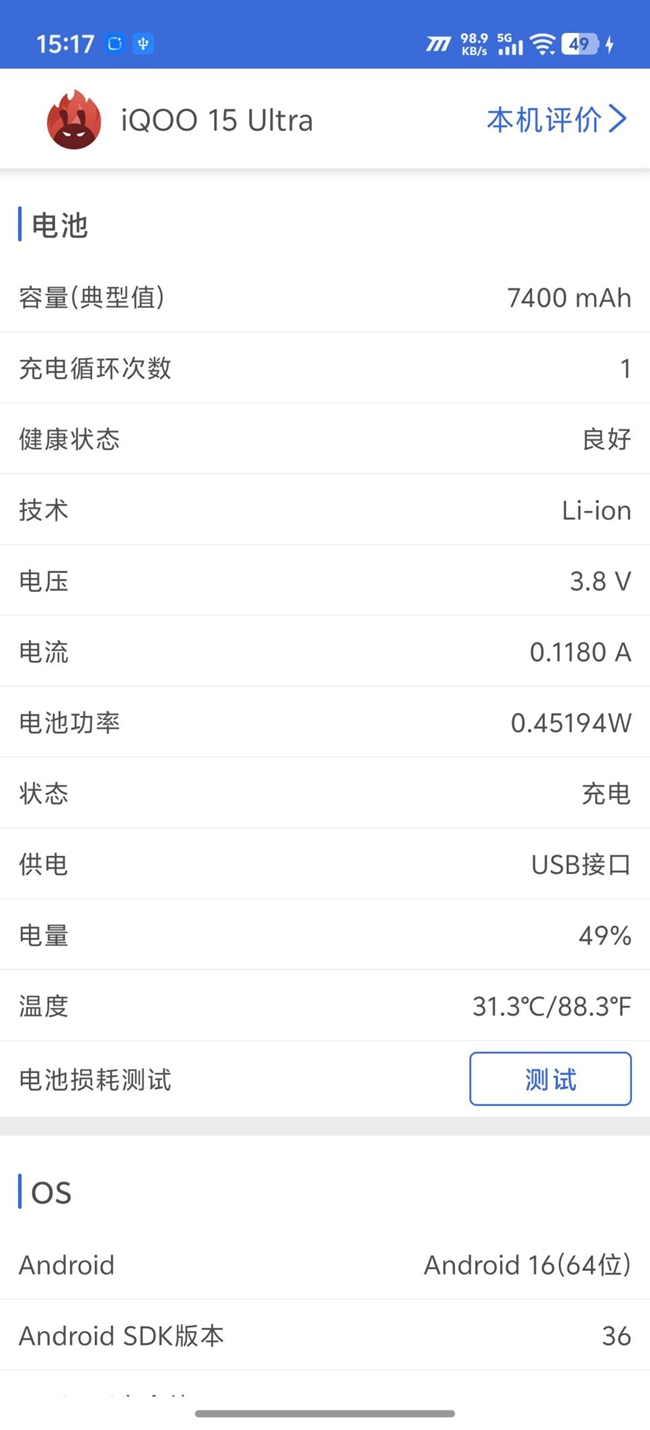 续航和充电方面,iQOO 15 Ultra同样给出了让人安心的配置。它内置了7400mAh的超大容量蓝海电池,配合能效优化的芯片与屏幕,日常综合续航轻松支撑一整天,实测连续游戏也能持久在线。当需要回血时,100W有线闪充能在约60分钟内将电量从零充满,快速又稳妥;同时还支持40W无线闪充。此外,它也延续了玩家喜爱的直驱供电功能,插着线玩游戏时能减少电池发热与损耗,让长时间对战更稳定、更安心。