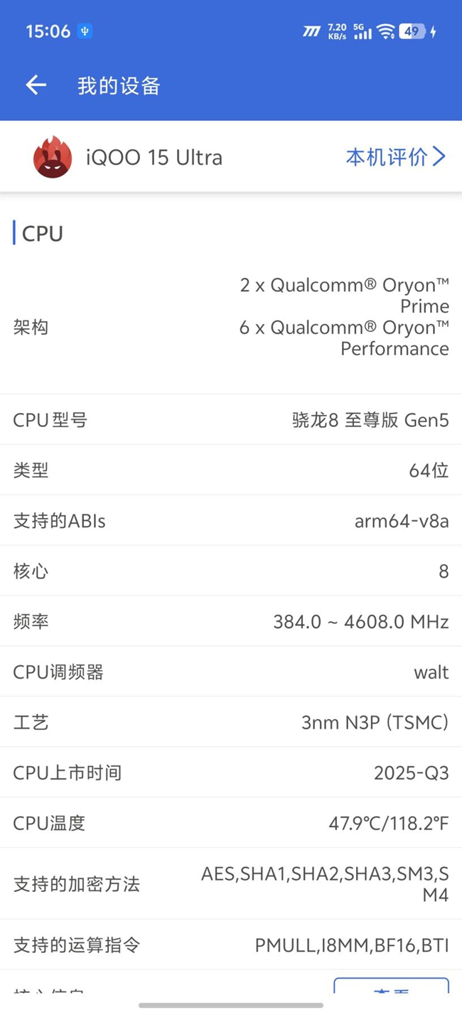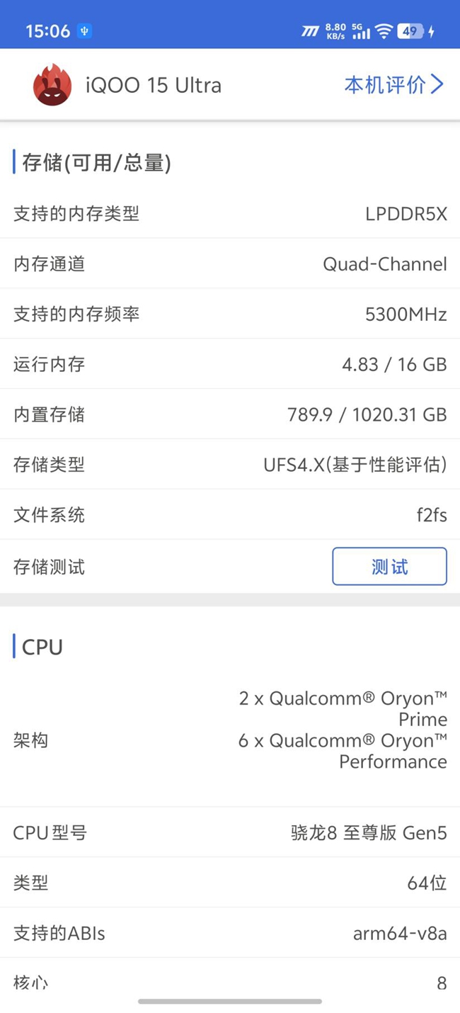 来到最核心的性能部分,iQOO 15 Ultra的配置堪称“硬核天花板”。它搭载了目前顶级的第五代骁龙8至尊版芯片,并配以UFS 4.1闪存和LPDDR5X Ultra Pro 10667Mbps内存,这套“性能铁三角”为极致体验打下了扎实的基础。
