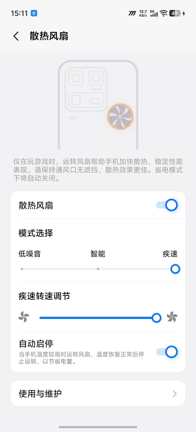 作为一款为极致玩家打造的性能Ultra机型,iQOO 15 Ultra针对游戏场景进行了全方位、深层次的优化。它搭载了主被动一体冰穹散热系统。这个主动风扇就藏在镜头模组下方,它拥有59片扇叶,尺寸达到了17×17×4mm,出风量充足,进风口和出风口都进行了防尘防水设计,安全性拉满。但更重要的是它足够聪明,共设有三个档位:低噪声档适合日常使用,安静不打扰;智能档能根据游戏负载自动调节转速,省心又高效;而当你进入高负载游戏时,开启疾速档,它能全力驱动,迅速带走核心热量。更贴心的是,这套系统支持36.5℃智能启停——手机觉得热了会自动开启,温度降下来则安静休息,完全不用你操心。如果你急着降温,还能通过控制台一键开启速冷模式,可以说,它在强劲散热与安静体验之间取得了出色的平衡。