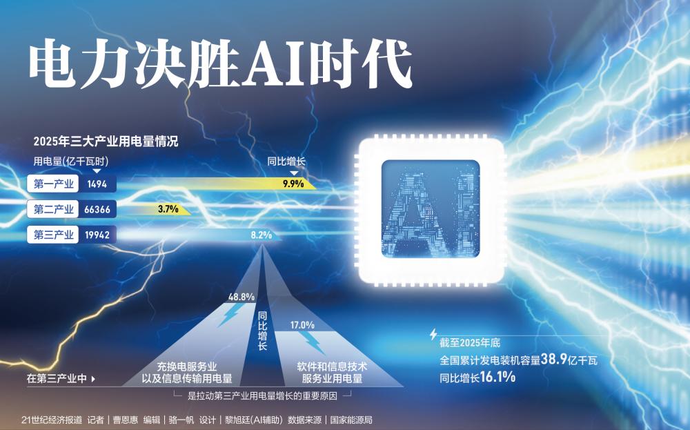 2025年累计发电装机容量38.9亿千瓦、全社会用电量首次突破10万亿千瓦时,当中国交出上述年度发用电成绩单时,一种观点引发热议:“中国发电能力将左右未来AI竞争力。”