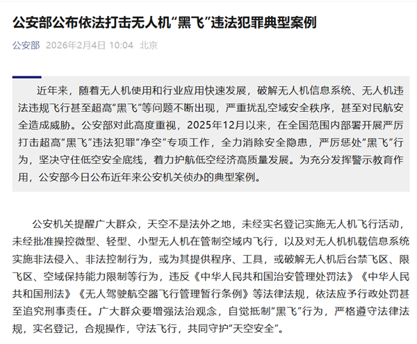 快科技2月5日消息,随着轻型无人机在民用领域广泛使用,随之而来的超高、超限等违规黑飞问题不断出现,扰乱空域安全秩序,甚至还对民航安全造成威胁。
