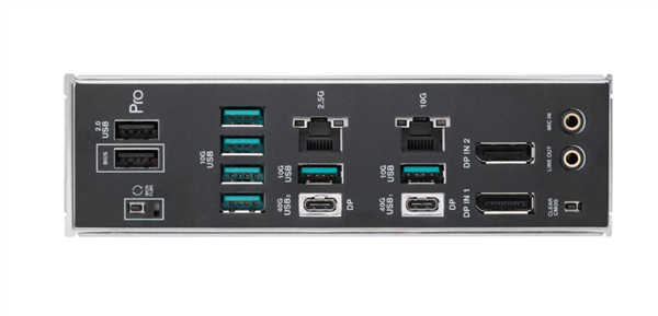 后置I/O面板配备了双Mini DisplayPort输入、一个VGA接口、两个USB4 Type-C接口、六个USB 10Gbps Type-A接口、两个USB 2.0 Type-A接口、一个10GbE网口、一个2.5GbE网口,以及BIOS Flashback按钮、Clear CMOS按钮和音频接口。