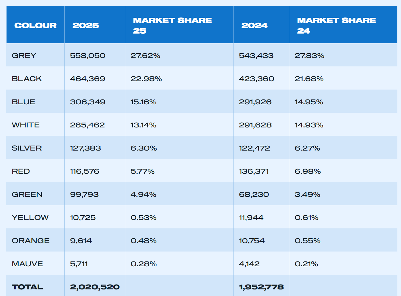 黑色以464,369辆的新车注册量保持了第二位——较去年强劲增长9.7%,达到自2019年以来的最高数量。蓝色第三次位居第三,确认了其作为英国首选非单色选择的地位,注册量为306,349辆(增长4.9%)。排名前三的颜色合计占2025年英国上路新车总量的近2/3(65.8%)。