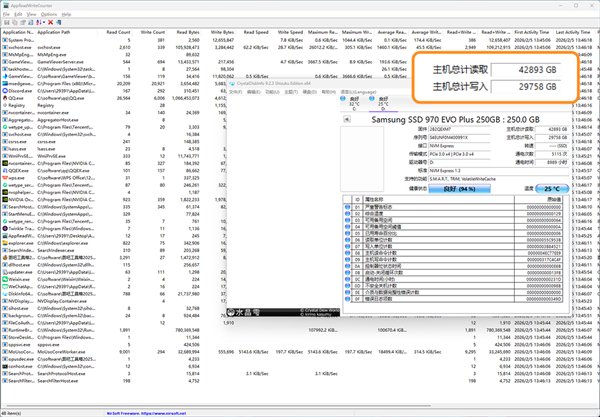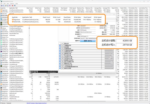 可以通过CrystalDiskInfo及Windows资源监视器等硬件级工具,对比Total Host Writes(主机写入总量)验证,从交叉结果来看雷神运行期间不会造成异常的物理写入增长。日志文件为小体量、顺序写入,不存在高频随机写盘行为。
