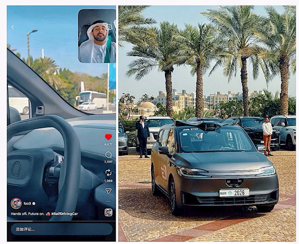 他乘坐车牌号为DUBAI 2026的无人车前往会场。体验结束后,他在社交媒体发文赞叹:“Hands off. Future on.(解放双手、未来已来!)”