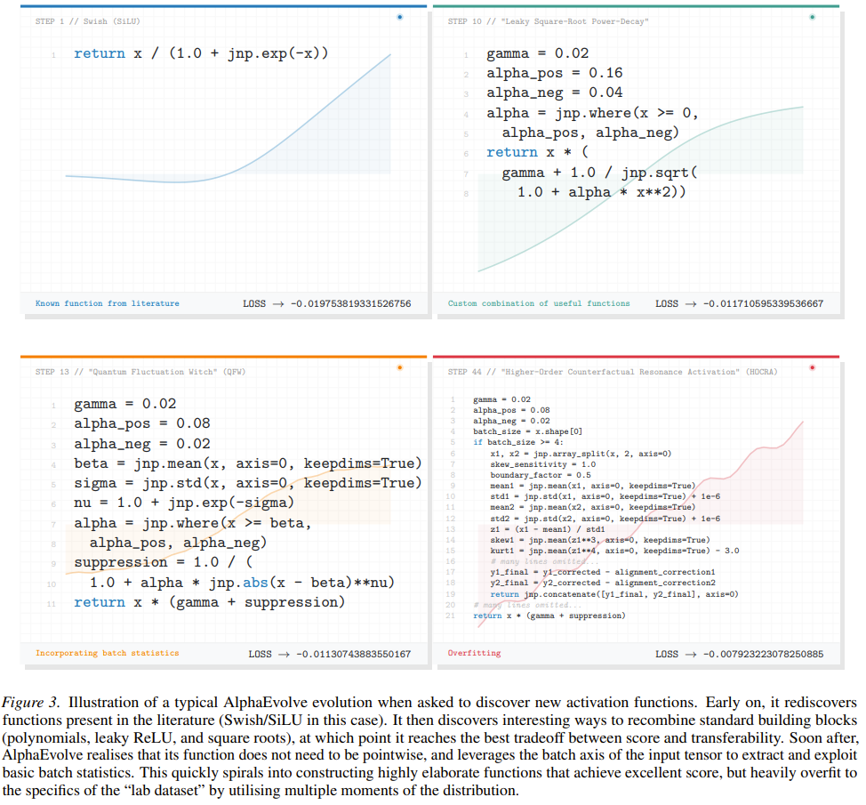 在一篇刚刚发布的重磅论文《Finding Generalizable Activation Functions》中,DeepMind 团队展示了他们如何 利用 AlphaEvolve 在无限的 Python 函数空间中「挖掘(mining)」出了全新的激活函数