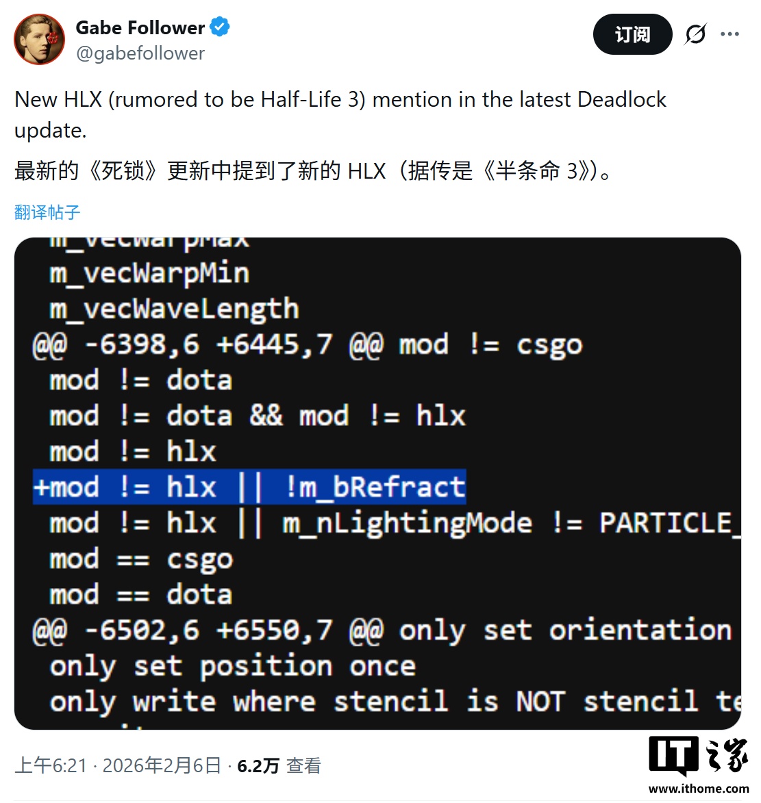 IT之家 2 月 7 日消息,消息源 @Gabefollower 深入挖掘 Valve 新作《Deadlock》更新代码,再次发现了代号为“HLX”(疑似《半条命 3》)的项目踪迹,表明该项目并未被取消。