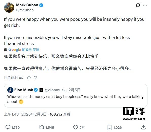 IT之家 2 月 7 日消息,身价超 8000 亿美元的世界首富马斯克本周四在 X 上发帖,称“‘金钱买不到幸福’这句话说得真是太对了”,遂引发大量关注与讨论。目前这条帖子的浏览量已超过 1 亿次。