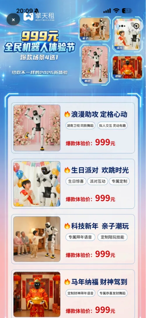 作为本次机器人奇妙夜的联合主办方之一,擎天租在晚会期间已经同步上线“999元全民机器人体验计划”,将舞台上的机器人能力,转化为普通用户能够在春节拜年、情人节求婚、亲子互动、庆祝生日等生活场景中体验的产品与服务。