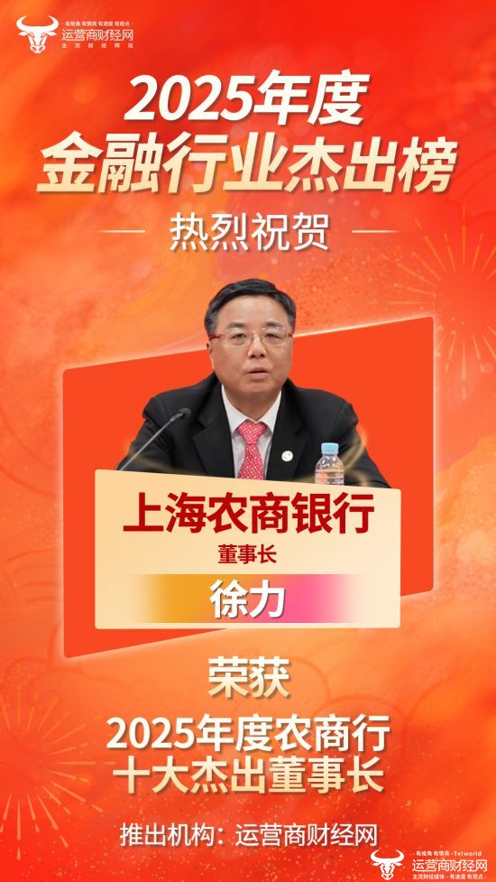 近日,由运营商财经网独家打造的“2025年度农商行十大杰出董事长”名单已公布。经过多方考量,上海农商银行董事长徐力凭借优秀的表现荣获此奖。