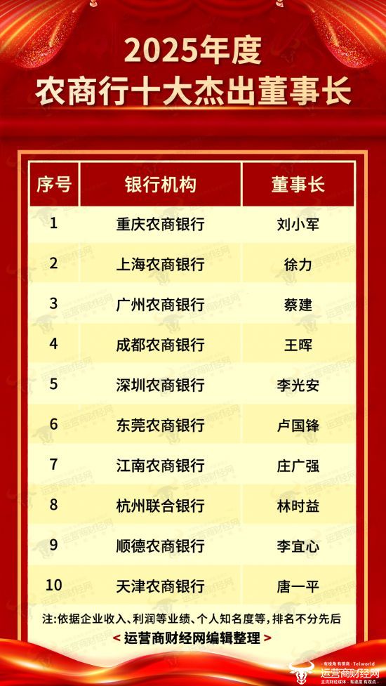 运营商财经网通过对我国农商行整体发展情况的观察,综合考量企业销量、营收、利润等业绩情况以及高管个人知名度、贡献等多种因素,打造了“2025年度农商行十大杰出董事长”榜单,力求全面客观公正。