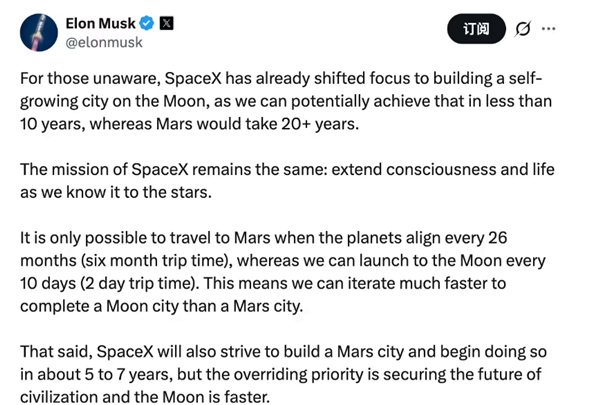 快科技2月9日消息,马斯克在社媒上称,SpaceX已经将重点转移到在月球上建造一个自我发展的城市,因为我们有可能在不到10年的时间内实现这一目标,而火星则需要20年以上。
