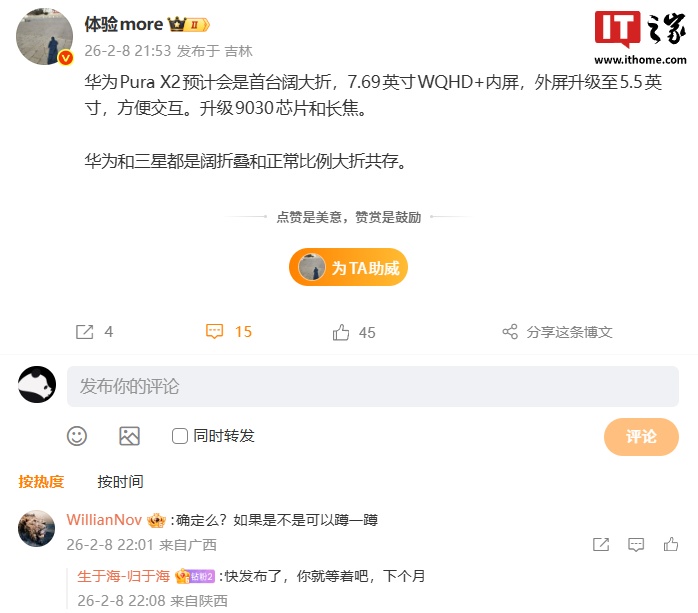 IT之家 2 月 9 日消息,博主 @体验more 昨晚发文透露,华为 Pura X2 预计会是首台阔大折:7.69 英寸 WQHD+ 内屏、外屏升级至 5.5 英寸,方便交互。另外,该机还会升级麒麟 9030 芯片和长焦。
