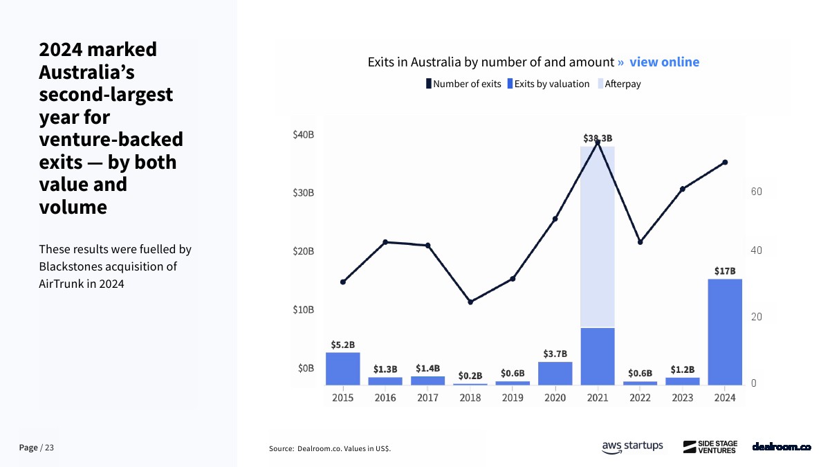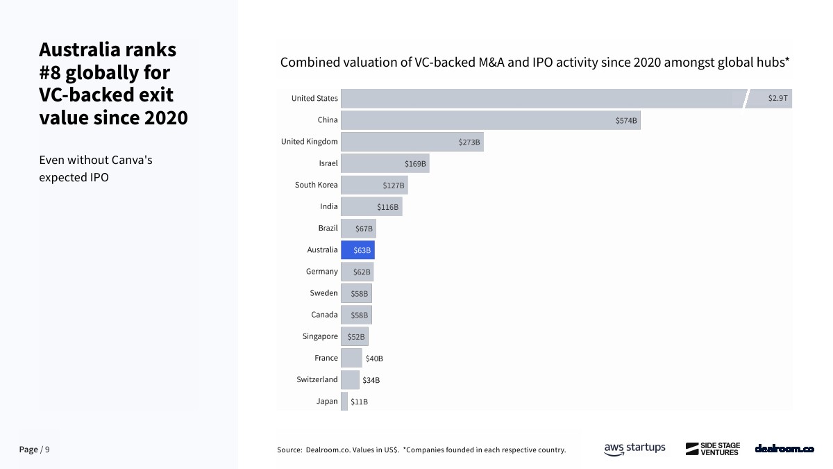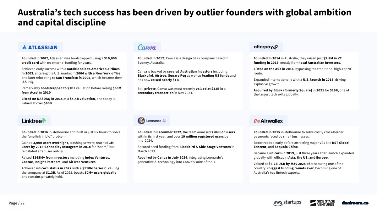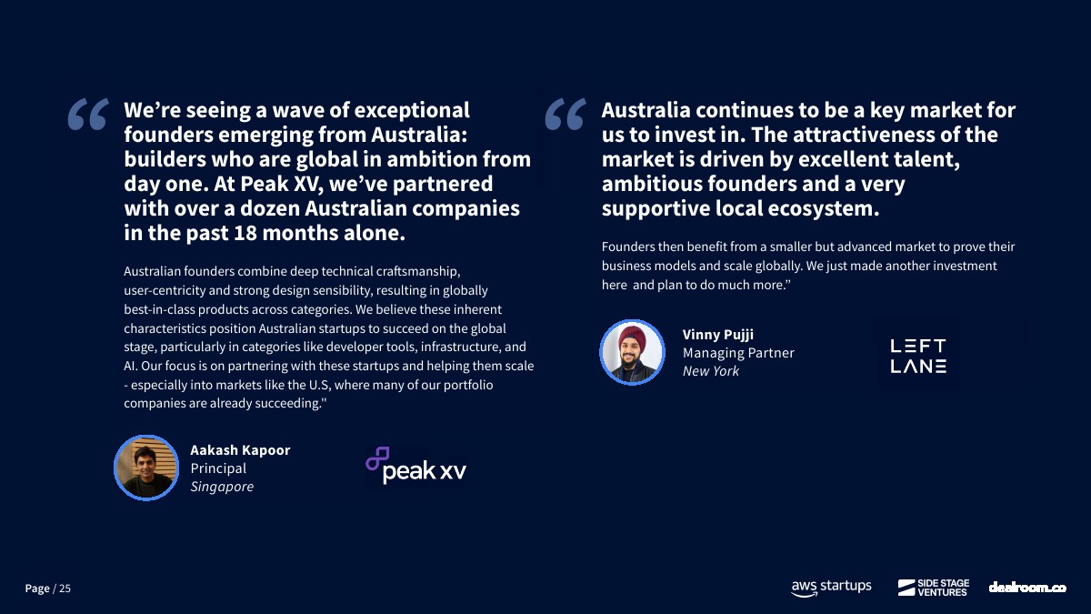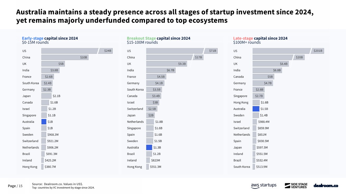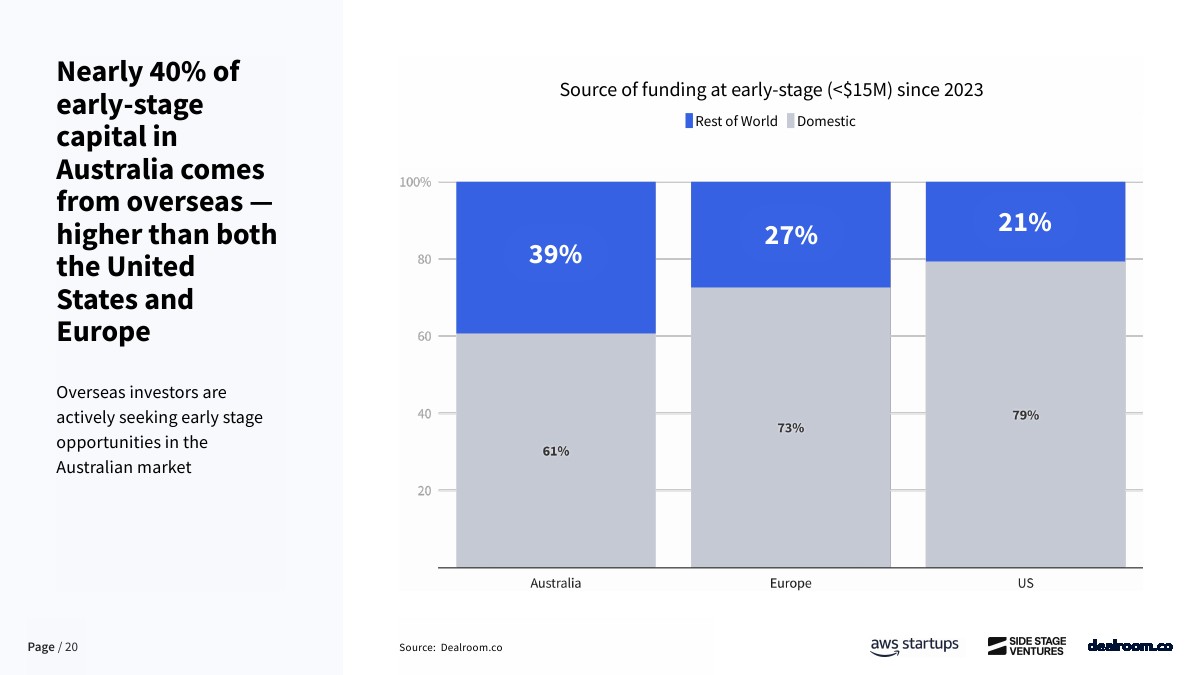 资金来源方面,澳大利亚对海外资本依赖度显著高于主要经济体。自2023年以来,早期阶段资金中仅61%来自本土投资者,约39%依赖海外资金,而欧洲和美国本土资金占比分别为73%和80%。这在一定程度上反映出本地早期资本供给不足,也为全球LP和跨境VC提供了估值更低、竞争更小的进入窗口。