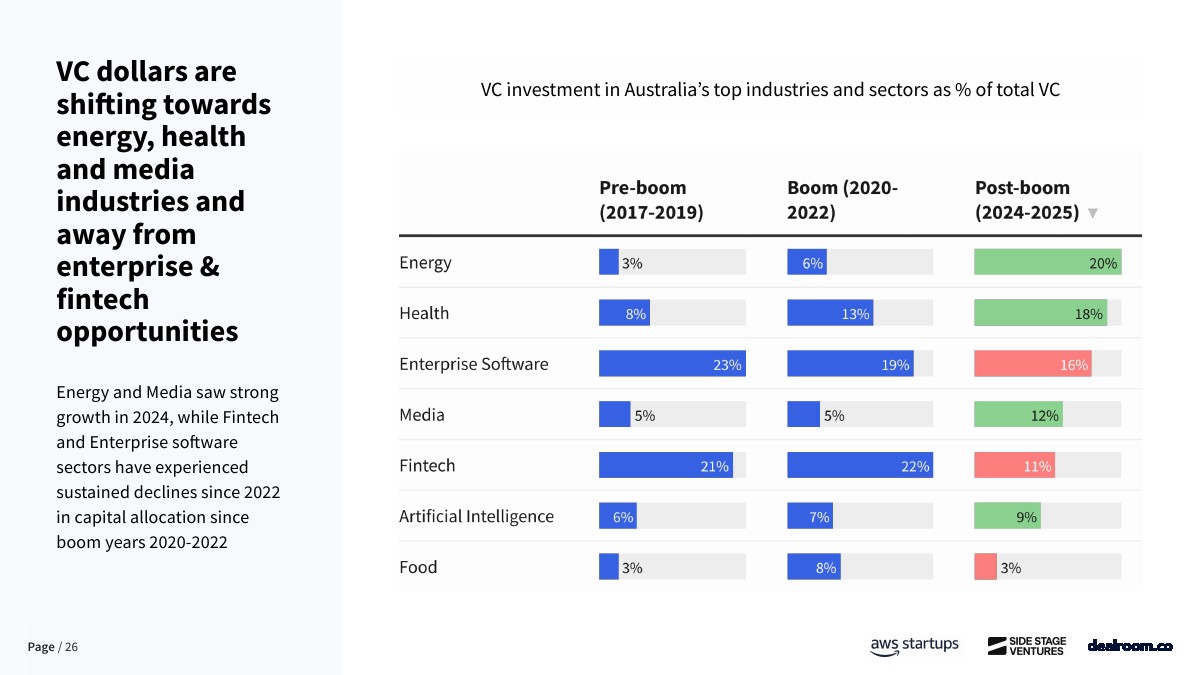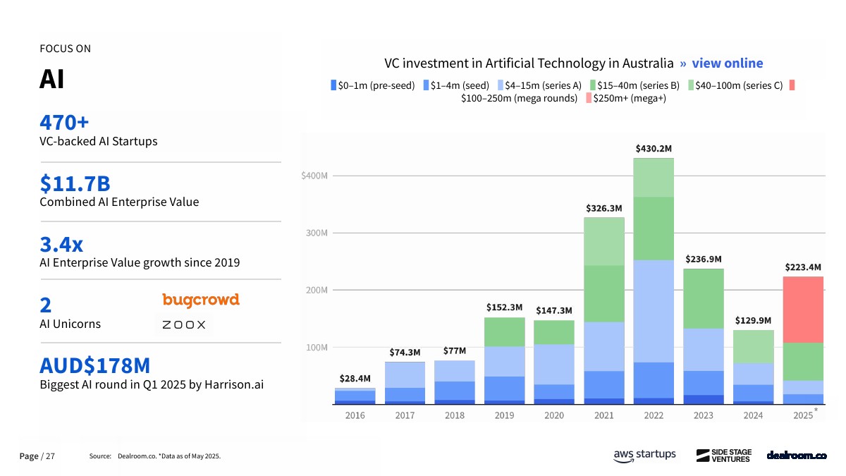 行业配置正在发生结构性变化。2024年后,能源、医疗健康和媒体板块的VC占比明显上升,其中能源投资占比由疫情前的3%提升至20%。相对而言,金融科技与企业软件自2022年后持续降温。人工智能成为最具确定性的增长引擎,目前澳大利亚拥有470余家VC支持的AI初创企业,AI相关企业总估值约117亿美元,自2019年以来增长3.4倍。