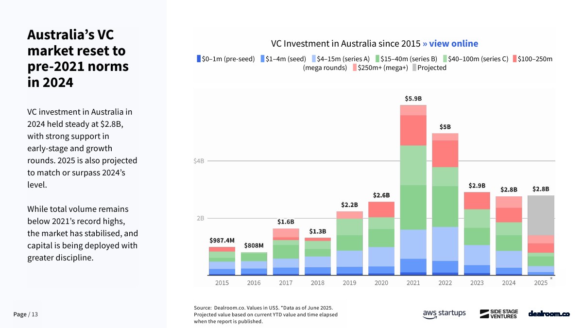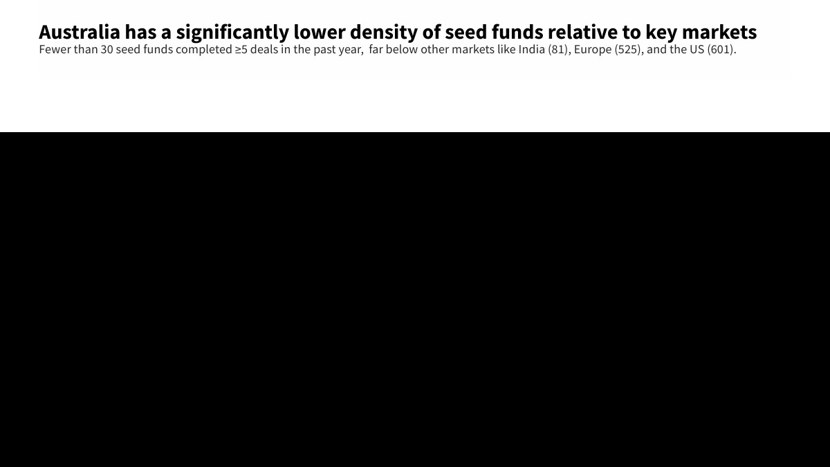 从资金结构看,澳大利亚创投市场仍处于明显的“资本不足”状态。2024年全年VC投资额约28亿美元,较2021年高点明显回落,但已恢复至理性区间。结构上,早期投资占比下降,后期与大额融资在2024年出现反弹。更值得关注的是,种子轮基金密度偏低,过去一年内完成5笔以上交易的种子基金不足30家,远低于美国的600余家和欧洲的500余家。