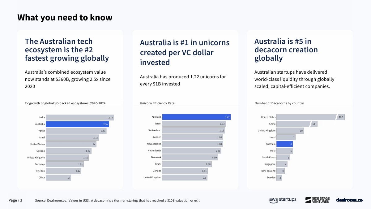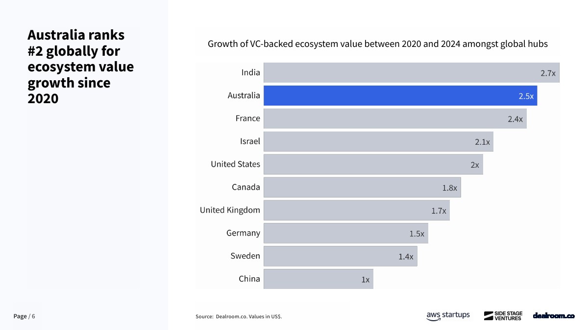 澳大利亚正在从长期被忽视的创投市场,转变为全球资本效率最高的创业生态之一。数据显示,截至2025年,其科技生态系统总价值已达3600亿美元,自2018年以来增长6.5倍,2020年至2024年期间生态价值增长2.5倍,增速位居全球第二。更具代表性的是,澳大利亚每投入10亿美元风险资本,平均可产生1.22家独角兽企业,全球排名第一,显著高于美国、欧洲等成熟市场。