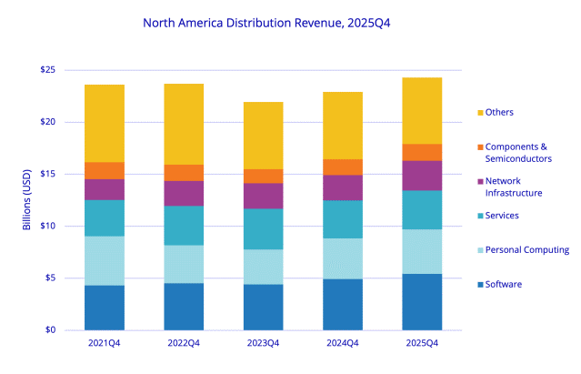根据GTDC提供的数据,2025年第四季度通过IT分销渠道的销售额同比增长6%,达到243亿美元,创下北美分销有记录以来最强劲的季度表现。