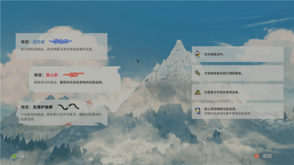 游戏开始,会给你提供三个难度选项,分别是探险者、登山家,以及像Alex那样的无保护独攀。这一刻,你能很清楚的感受到,《孤山独影》真的想要给你营造原汁原味的攀岩体验。