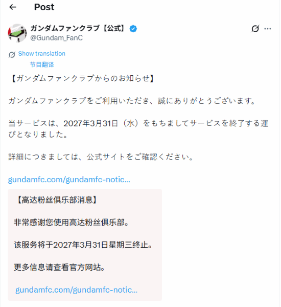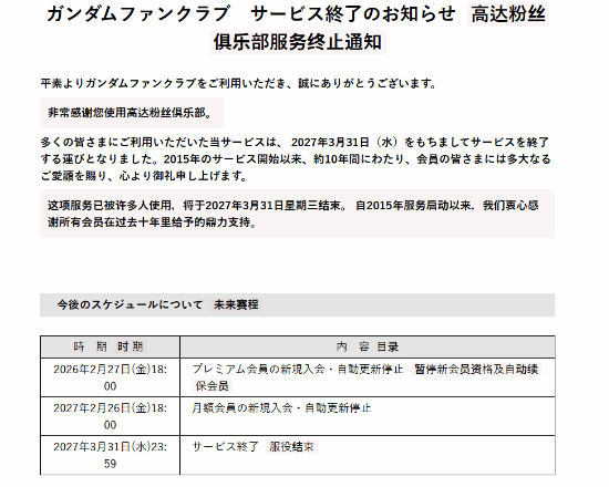 2月10日消息,2015年上线的高达官方APP“Gundam Fan Club”正式宣布,将于2027年3月31日停止服务,这意味着运营十余年的高达官方粉丝俱乐部将正式停办,引发众多高达粉丝关注与感慨。