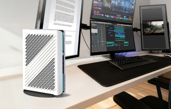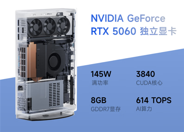 机身采用白色设计,饰有RGB灯带与波浪纹理,并内置350W电源,支持核心部件持续输出245W功率(GPU 145W + CPU 100W),性能表现可与高端游戏本媲美。