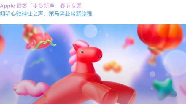 Apple 播客同步上线「步步新声」春节专题,以兼具温暖与治愈的内容,为用户注入新年灵感与勇气,陪伴用户心怀骏马之志,奔赴崭新旅程。
