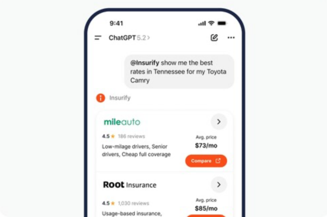 【iMobile爱科技资讯】2月11日消息(当地时间2月9日),根据美国在线保险平台Insurify官方消息,其正式推出了全球首款专为ChatGPT打造的保险比价与咨询应用。这款应用入驻了OpenAI的应用库(App Library),允许数亿用户直接通过自然语言对话获取汽车保险方案,彻底告别了反复填写复杂表单和访问多个网站的传统模式。