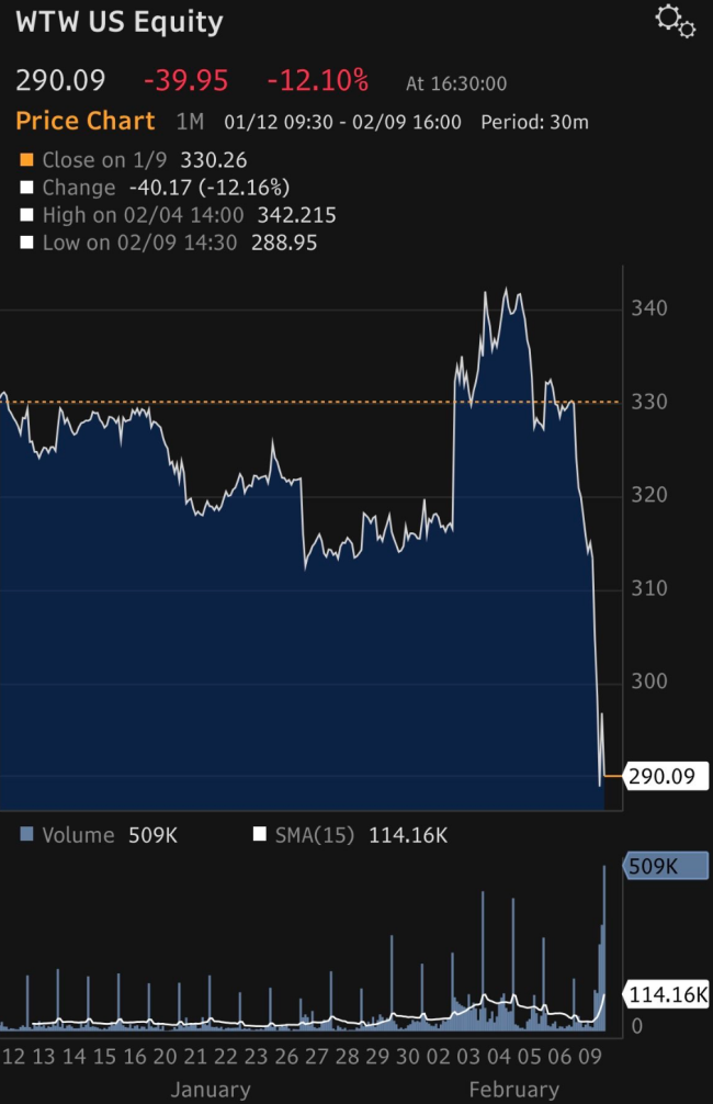 这一“AI黑科技”的落地瞬间在资本市场掀起飓风。因市场担忧 AI 智能体将取代传统保险经纪人的“中间商”角色,美股保险经纪板块遭遇集体大跌。标普500保险指数周一收跌3.89%,创下自去年10月以来的最大单日跌幅。其中,行业巨头Willis Towers Watson(WTW)暴跌12.10%,创下自2008年金融危机以来的最差单日表现;Arthur J. Gallagher与Aon分别录得9.85%和9.27%的显著跌幅。