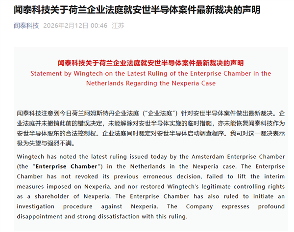 快科技2月12日消息,闻泰科技官方发布《关于荷兰企业法庭就安世半导体案件最新裁决的声明》。