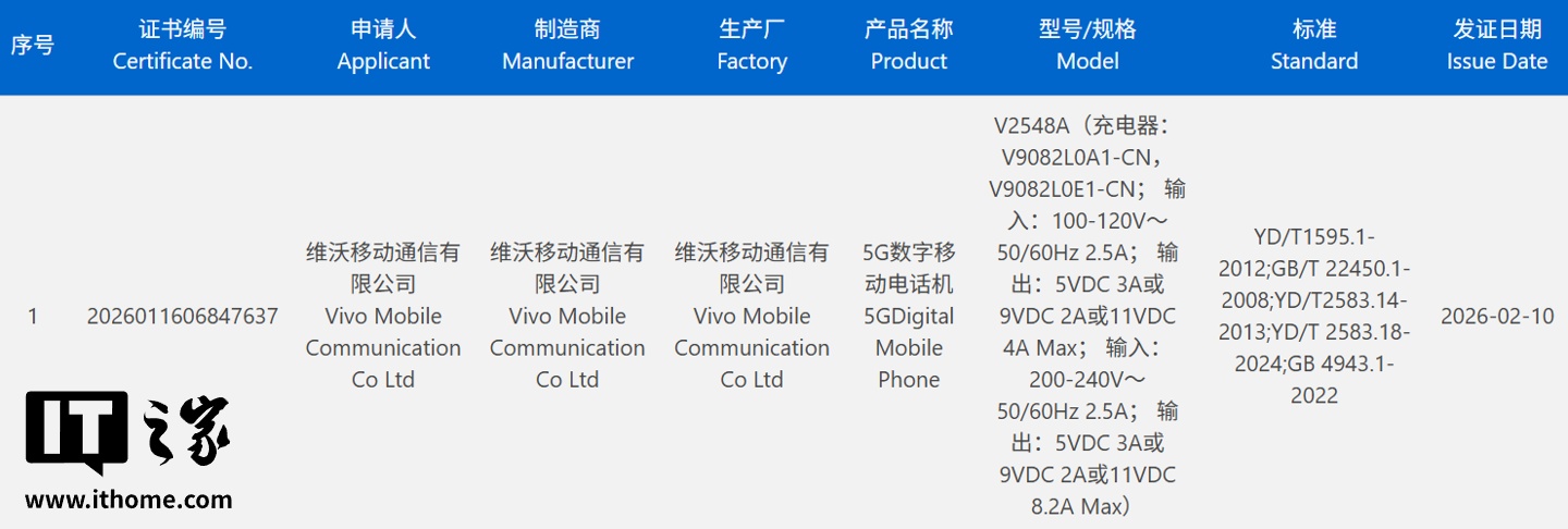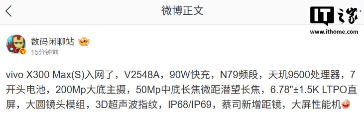 IT之家 2 月 12 日消息,一款型号为 V2548A 的 vivo 新机于 2 月 10 日通过了 CCC 认证,博主 @数码闲聊站 今日确认该机为 vivo X300 Max(S)。