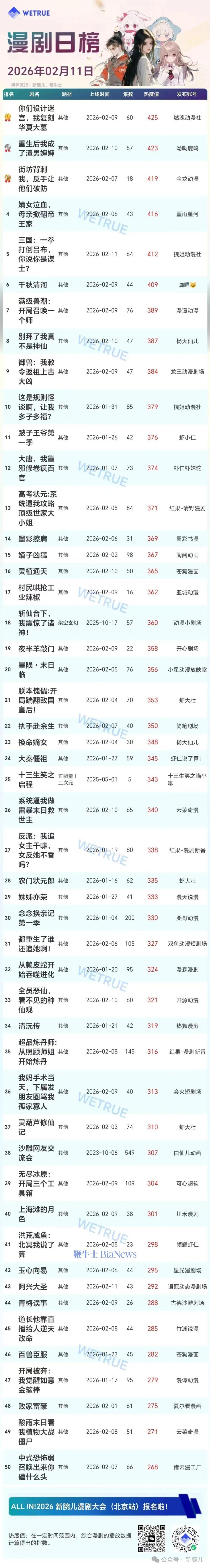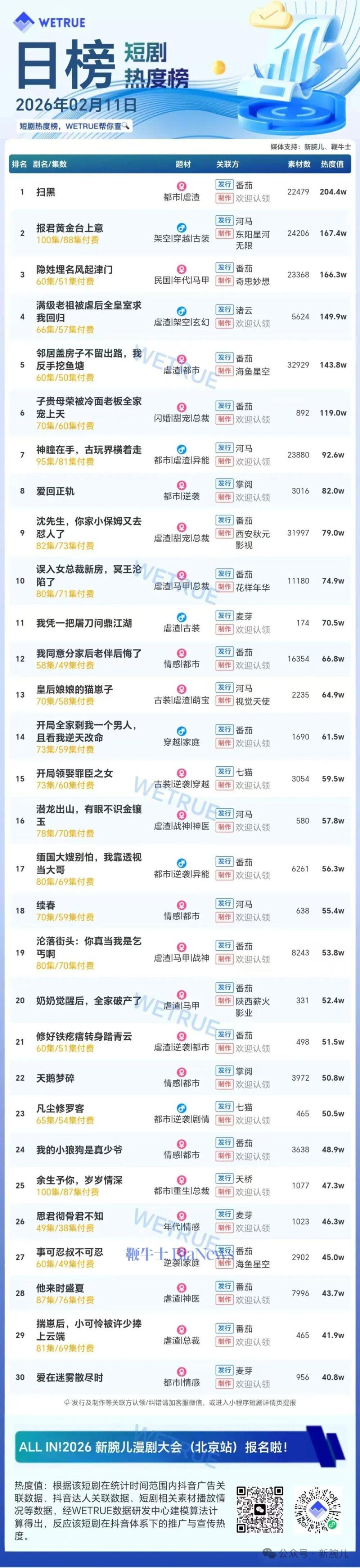 今天发布的是昨天(2月11日)漫剧及短剧付费大盘日榜。