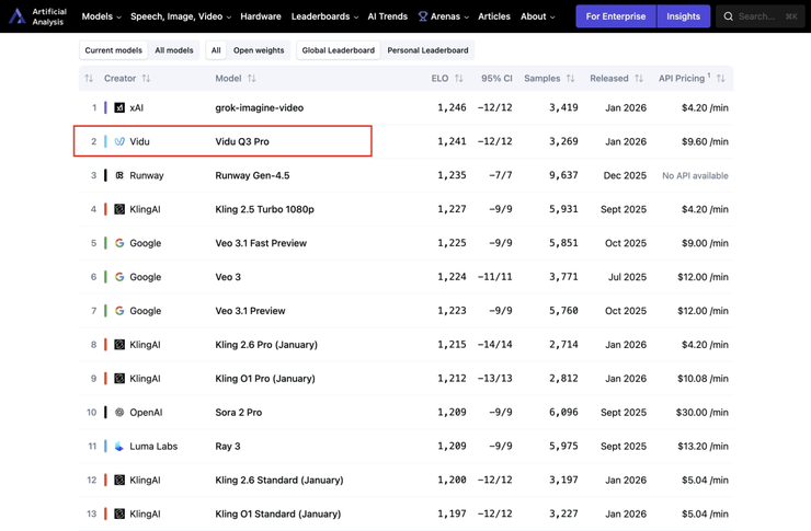 在国际权威AI基准测试机构 Artificial Analysis 最新公布的榜单中,生数科技的 Vidu Q3 凭借其在一致性、叙事性和音画同步上的极致表现,位居全球第二、中国第一。它不仅在评分上硬刚马斯克的 xAI Grok,更是超越了 Runway Gen-4.5、Google Veo 3.1 和 OpenAI Sora 2,成为了领跑视频生成下半场的关键变量。