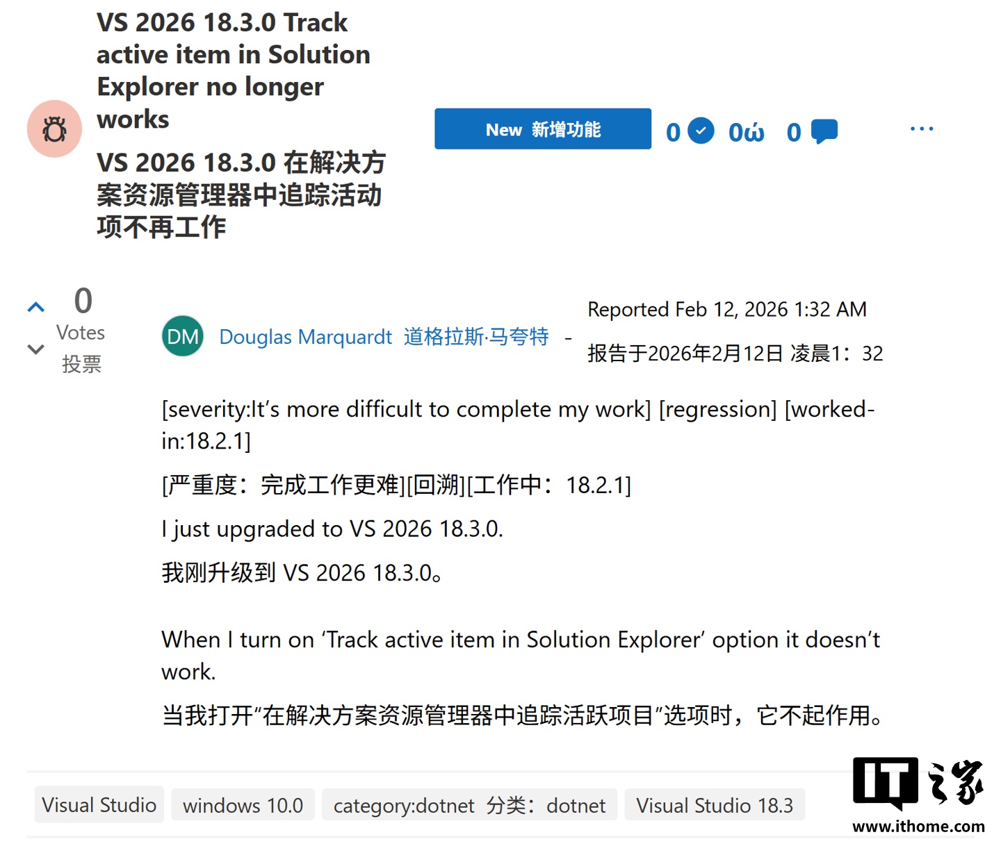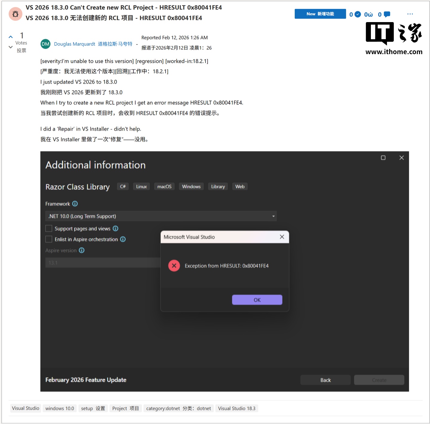 IT之家查询社区用户反馈,部分用户反馈 Visual Studio 更新到 18.3.0 后,项目无法加载,以及无法创建新的 RCL 项目,会收到 HRESULT 0x80041FE4 的错误提示。