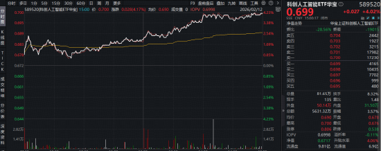 科创人工智能ETF(589520)及其联接基金(联接A:024560,联接C:024561)重点布局国产AI产业链,成份股囊括国产GPU龙头(如寒武纪),国产ASIC龙头(如芯原股份)、AI应用龙头(如金山办公 ),半导体行业权重占比近一半,具备较强进攻性;软件行业权重占比超三成,有望受益于AI应用补涨行情。同时,该ETF是融资融券标的,是一键布局国产算力的高效工具。
