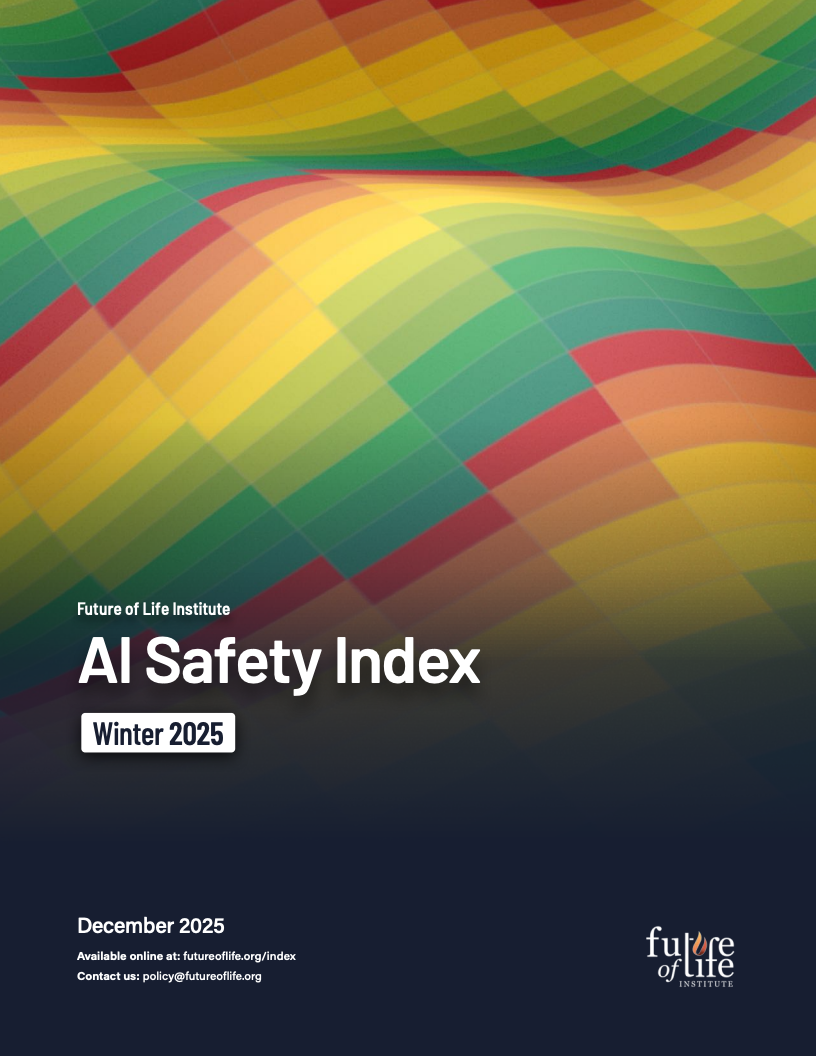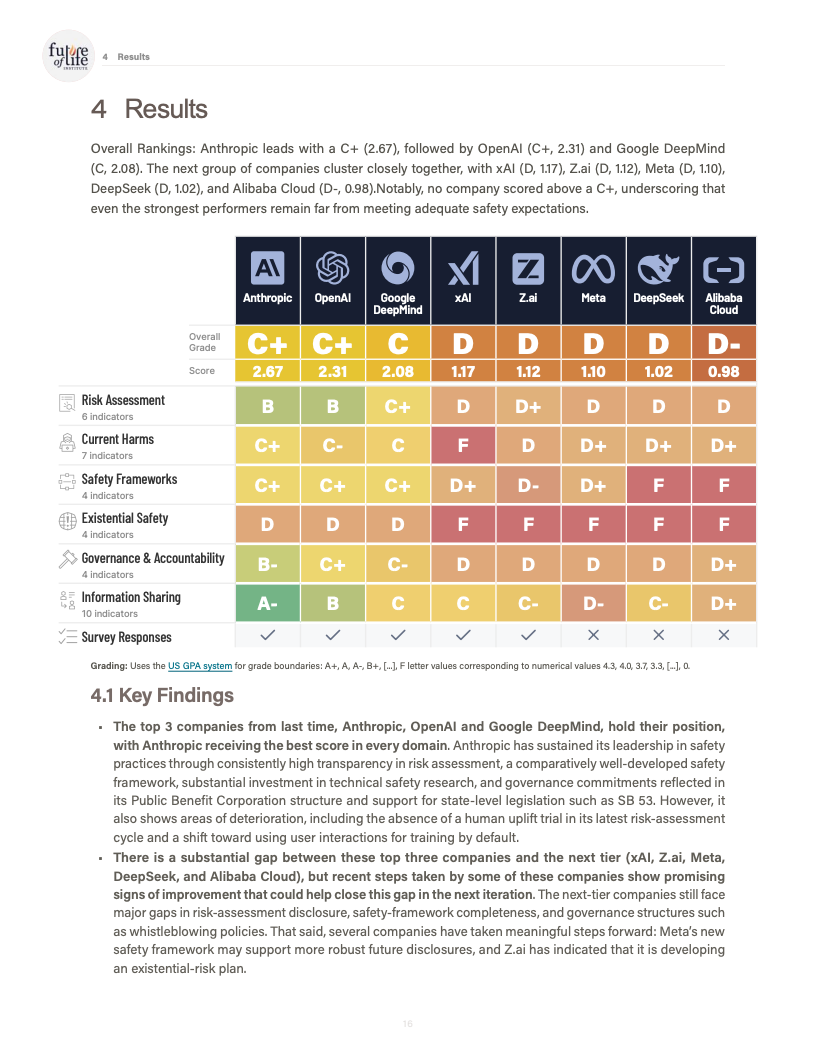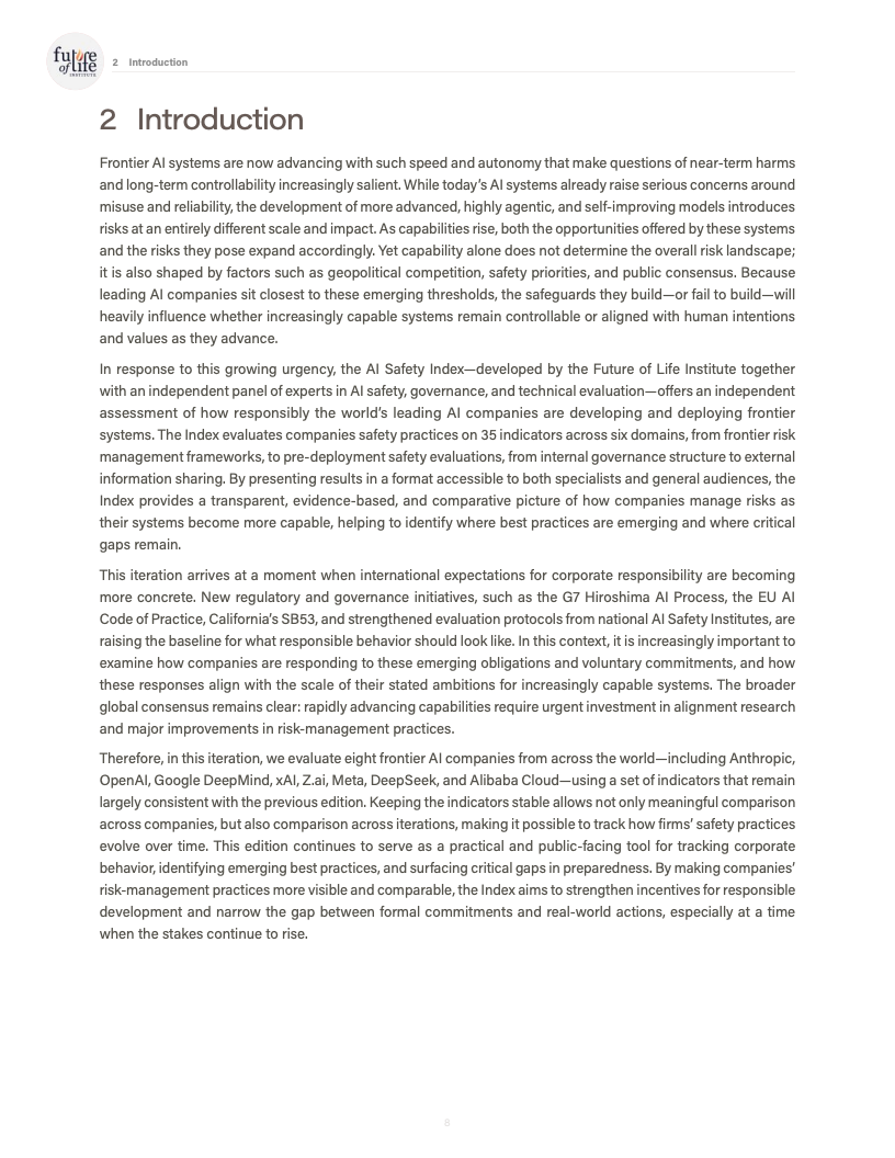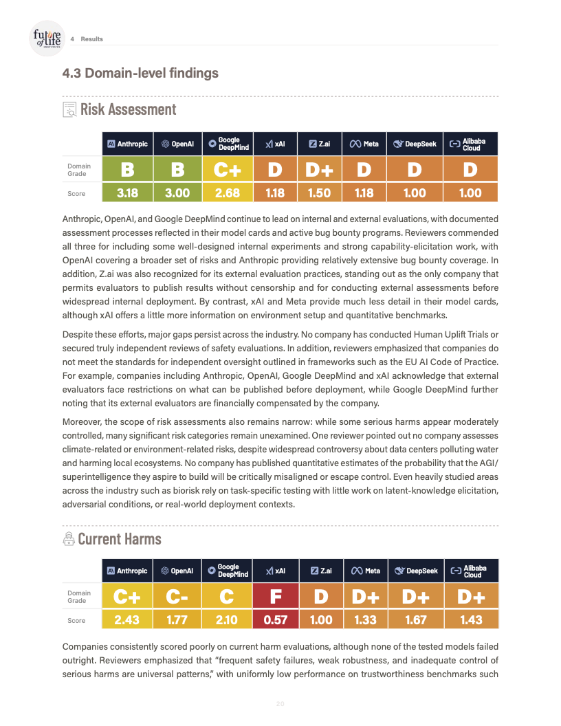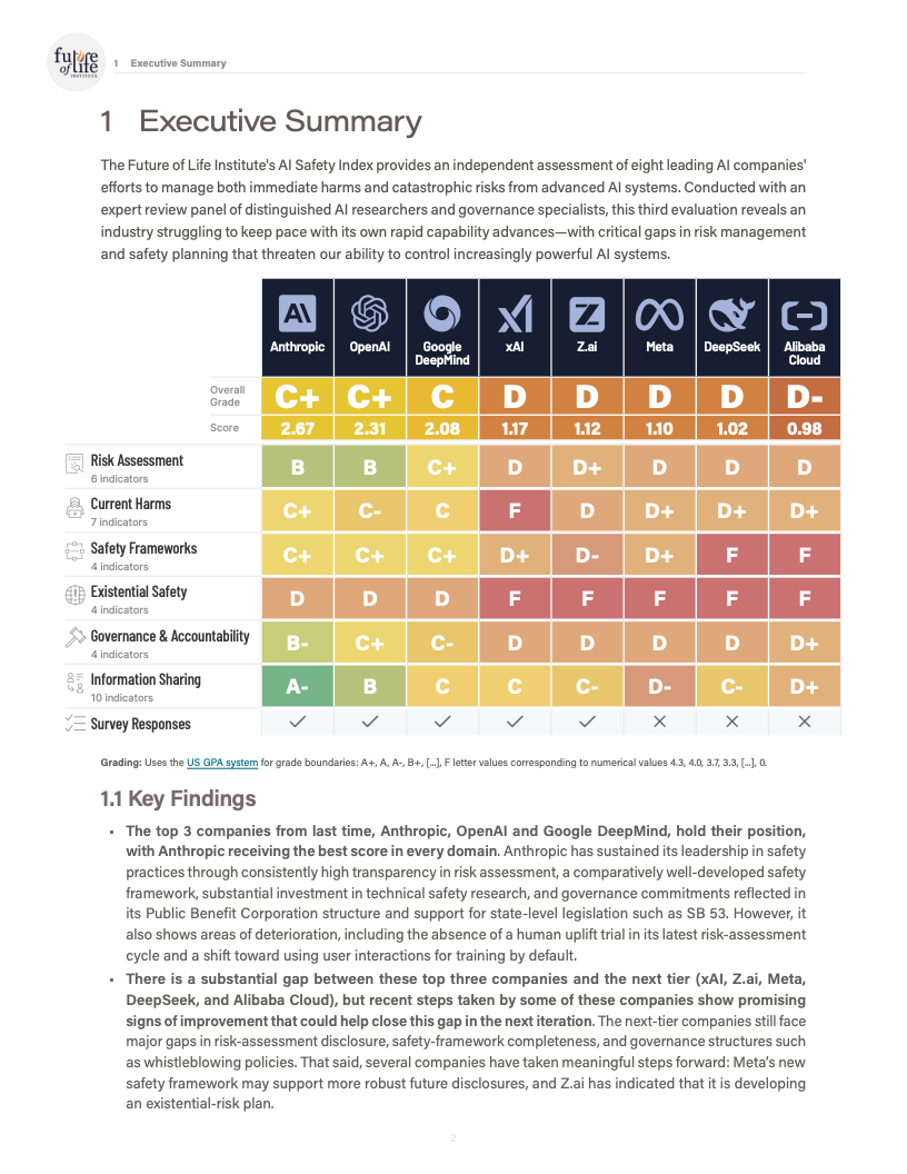 由未来生命研究所发布的《AI Safety Index 2025》对全球八家处于能力前沿的人工智能公司进行了系统性评估,覆盖风险评估、现实危害、安全框架、生存性风险、治理与问责以及信息披露六大维度,共计三十余项指标。评估结果显示,行业整体安全治理水平明显滞后于模型能力的跃迁速度,结构性缺口正在扩大。