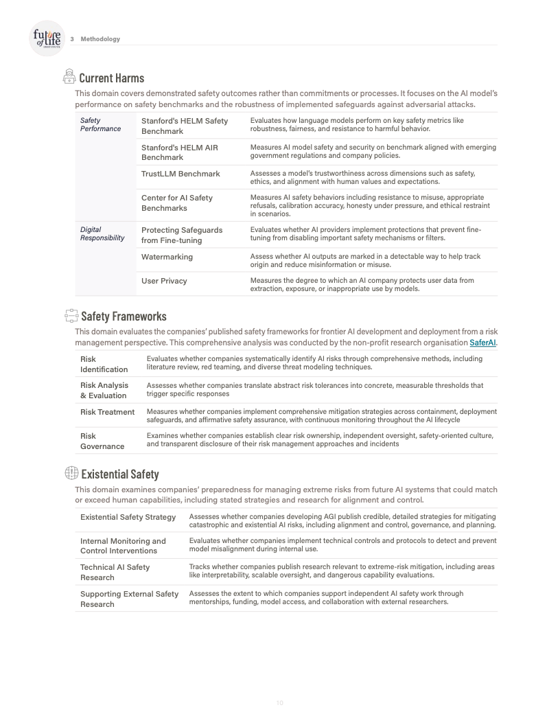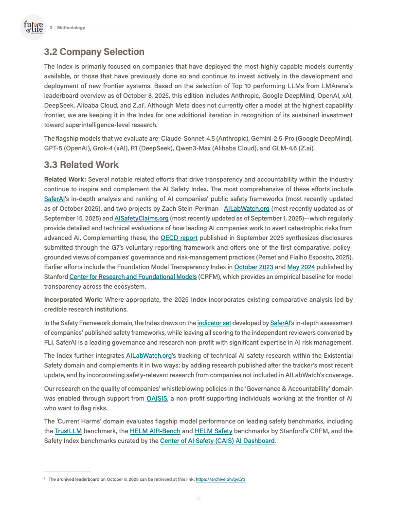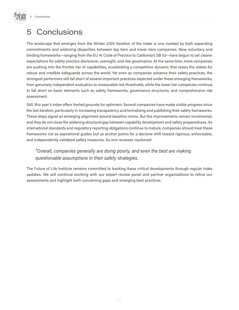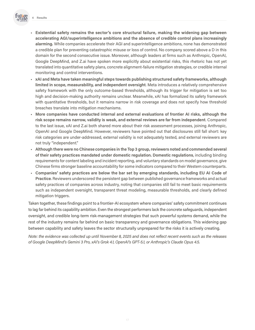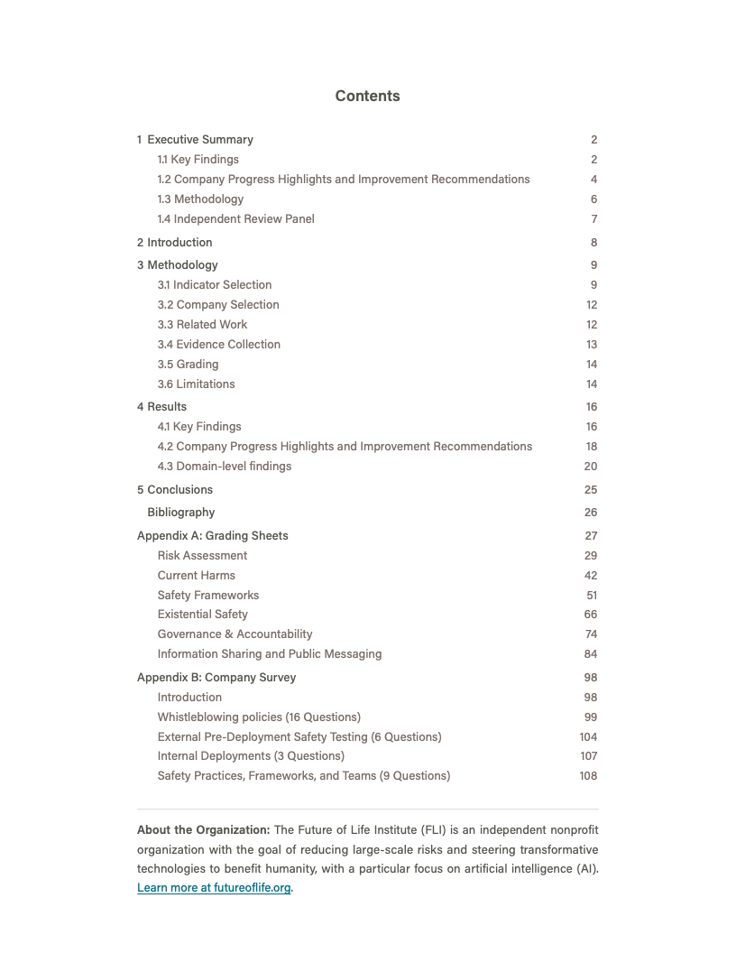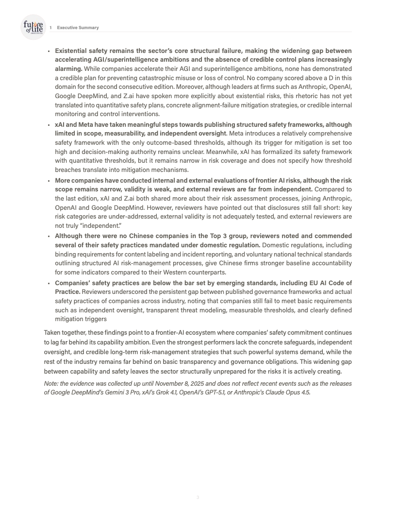 由未来生命研究所发布的《AI Safety Index 2025》对全球八家处于能力前沿的人工智能公司进行了系统性评估,覆盖风险评估、现实危害、安全框架、生存性风险、治理与问责以及信息披露六大维度,共计三十余项指标。评估结果显示,行业整体安全治理水平明显滞后于模型能力的跃迁速度,结构性缺口正在扩大。