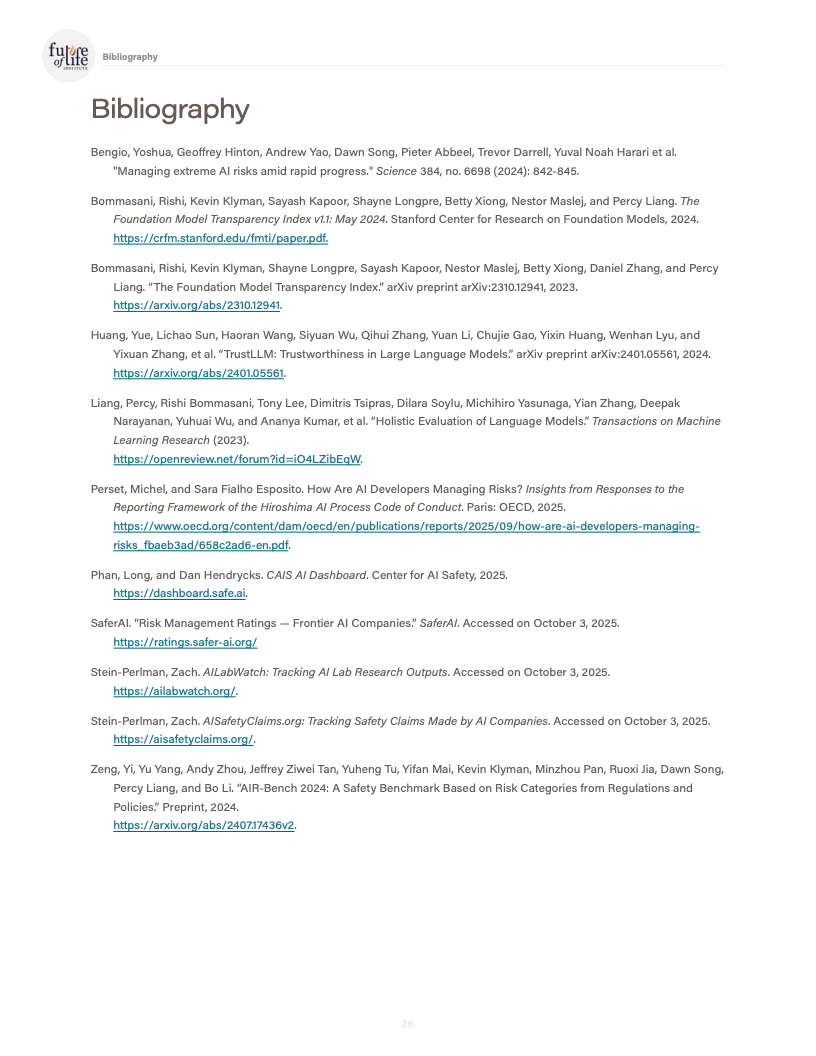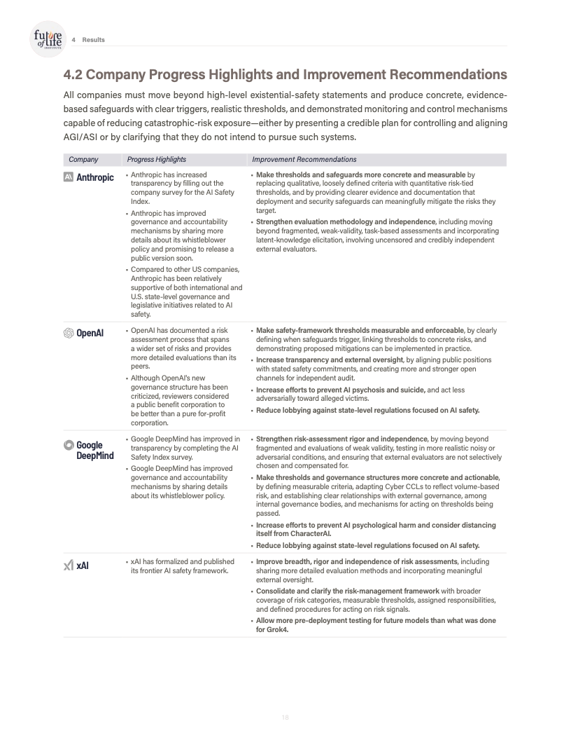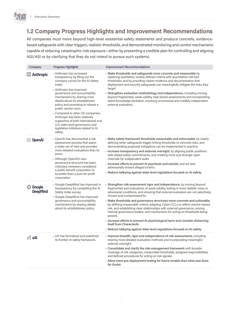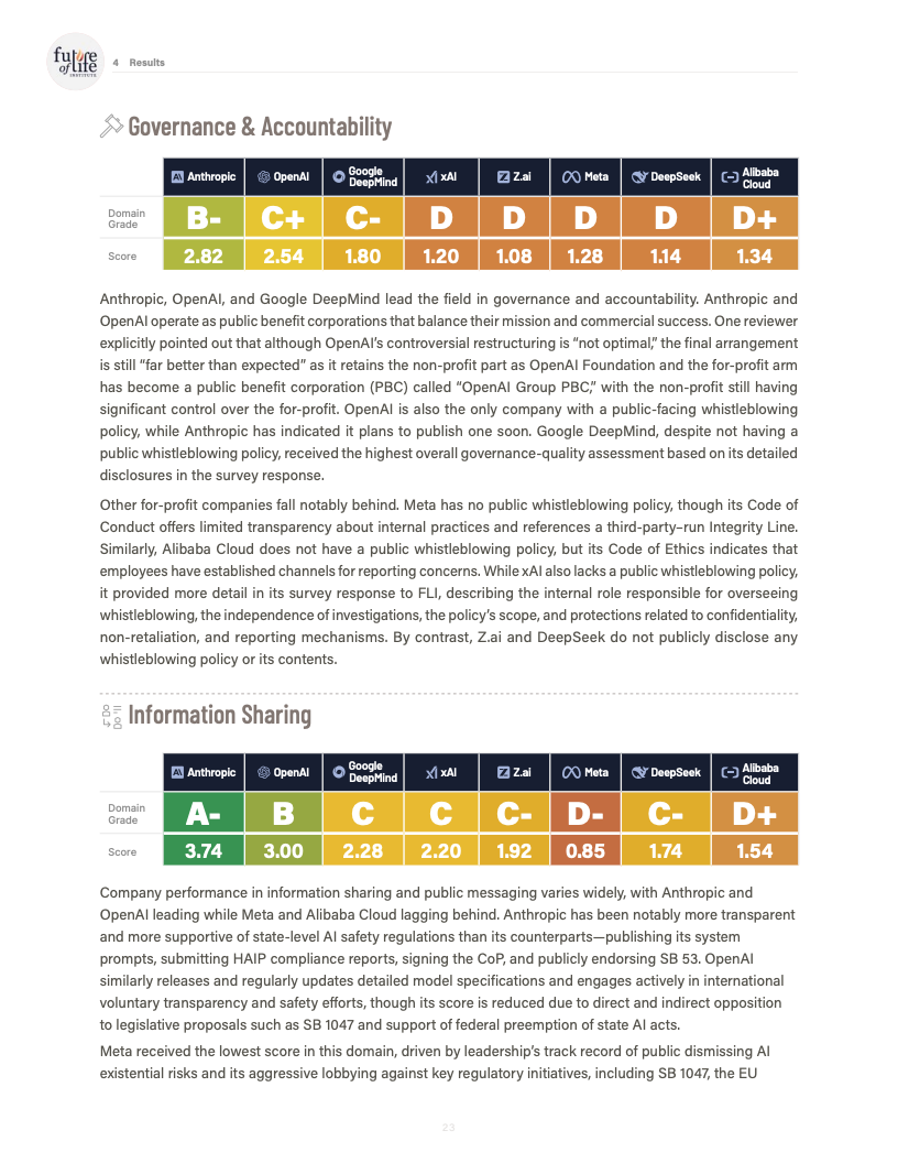 信息披露与公共沟通方面,参与国际自愿性承诺的公司数量有所增加,但在系统提示、行为规范和重大事故报告机制上,公开信息依然有限。报告特别指出,安全框架“已发布但实施情况不明”成为多家公司的共同特征,治理文件与实际操作之间存在脱节。