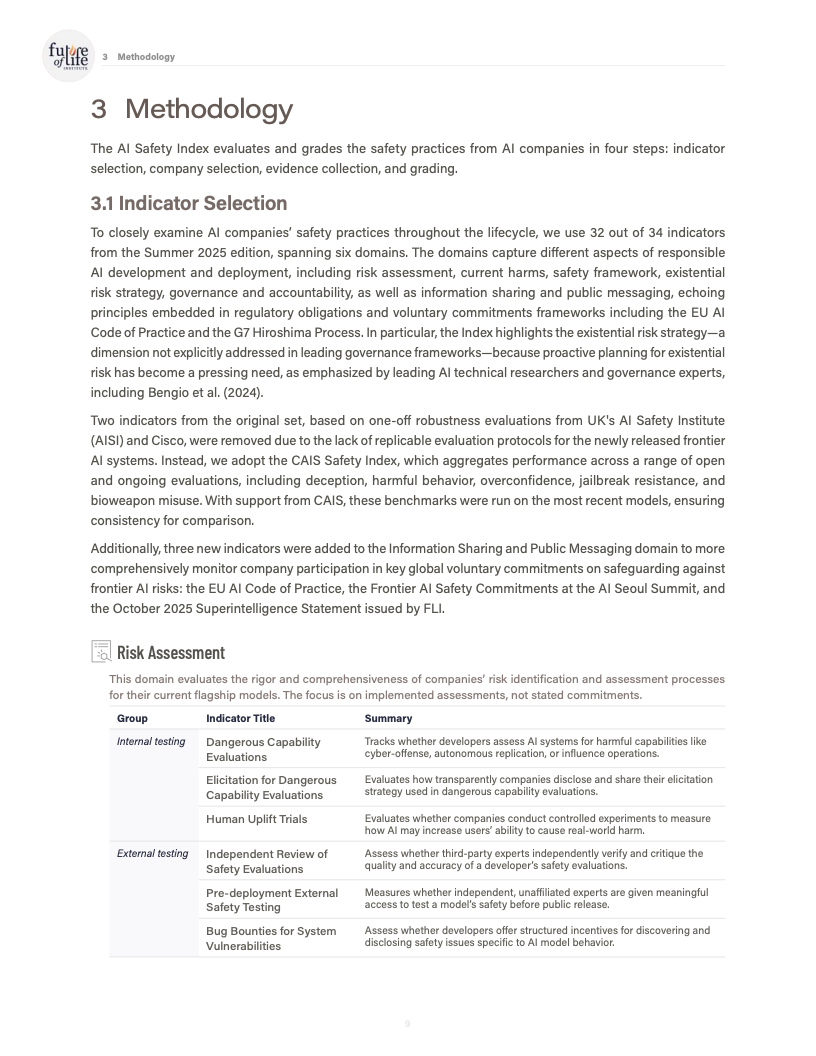 在风险评估维度,越来越多企业开展了内部和外部测试,但评审认为测试覆盖的风险类型仍然偏窄,外部评估的独立性与可验证性不足。人类能力放大试验、第三方预部署安全测试和漏洞赏金机制,仍主要集中在少数头部公司,行业整体普及率偏低。