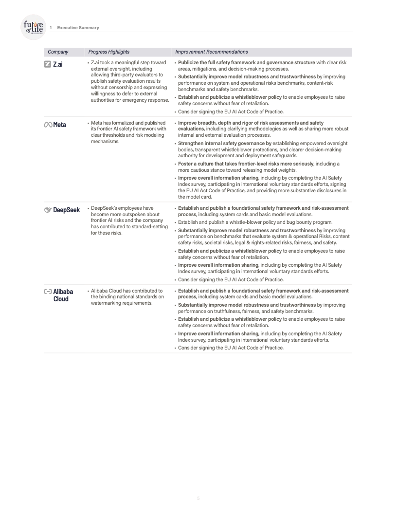 第二梯队由 xAI、Z.ai、Meta、DeepSeek 与阿里云构成,与前三名之间存在明显断层。多数公司在风险评估披露、安全框架完整性及治理机制方面仍存在基础性不足,尤其是在举报人保护制度、外部独立评估和量化风险阈值方面。尽管如此,xAI 与 Z.ai 在本轮中披露了更多内部风险评估流程,显示出一定改善迹象。